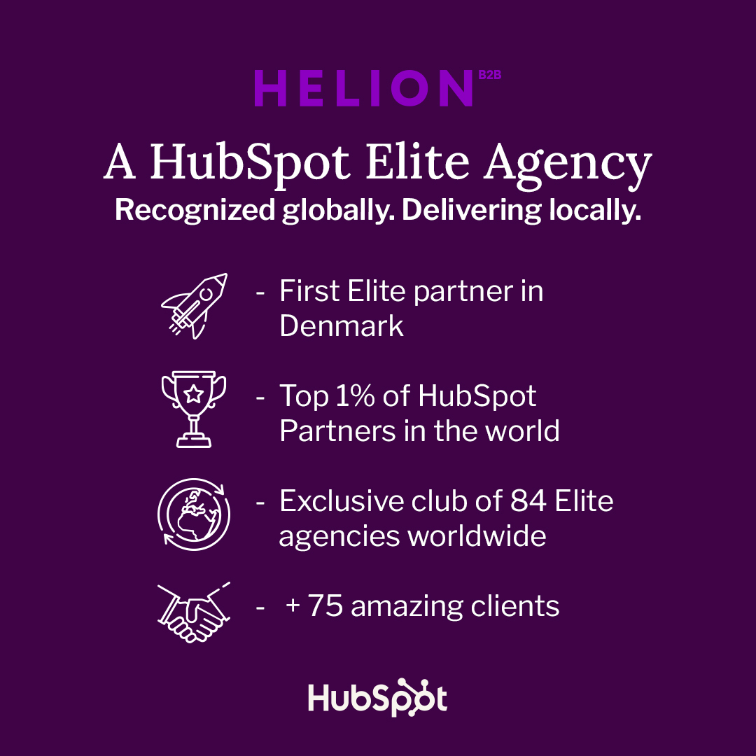 Helion B2B er som det første danske bureau nogensinde blevet HubSpot Elite Partner, som er den højeste status, et bureau kan opnå. En lang række danske og internationale virksomheder bruger HubSpot, der er verdens største og førende automation-platform inden for marketing, salg, service, operations, CMS og CRM.