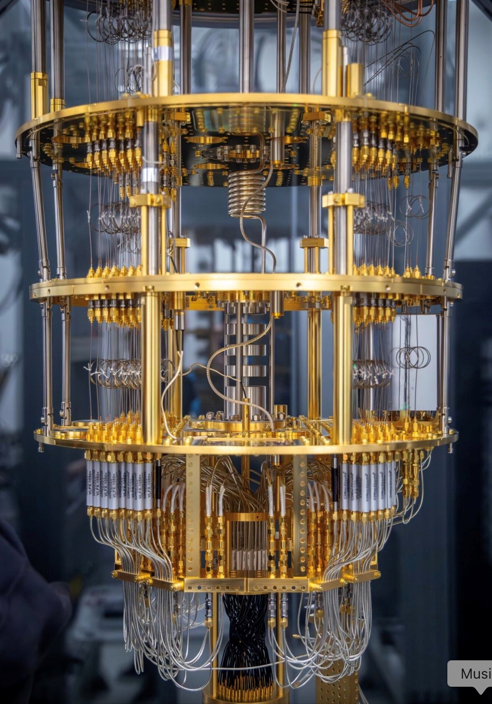 - For at fungere skal qubits holdes ved en ekstremt lav temperatur — kun 0,01 Kelvin over det absolutte nulpunkt (dvs. omkring –273,14 °C), koldere end det ydre rum. Denne ”frosne” tilstand opnås ved hjælp af en speciel kryostat, hvor en del af den ligner en flerlaget, skinnende gylden lysekrone på cirka 300 kg. Sådan køling er afgørende, da selv en lille mængde varme kan ødelægge qubits’ skrøbelige kvantetilstande. Selve chippen er placeret i bunden af kryostaten, og de ekstremt lave driftstemperaturer opnås ved hjælp af kvanteeffekter, når helium-isotoper blandes.