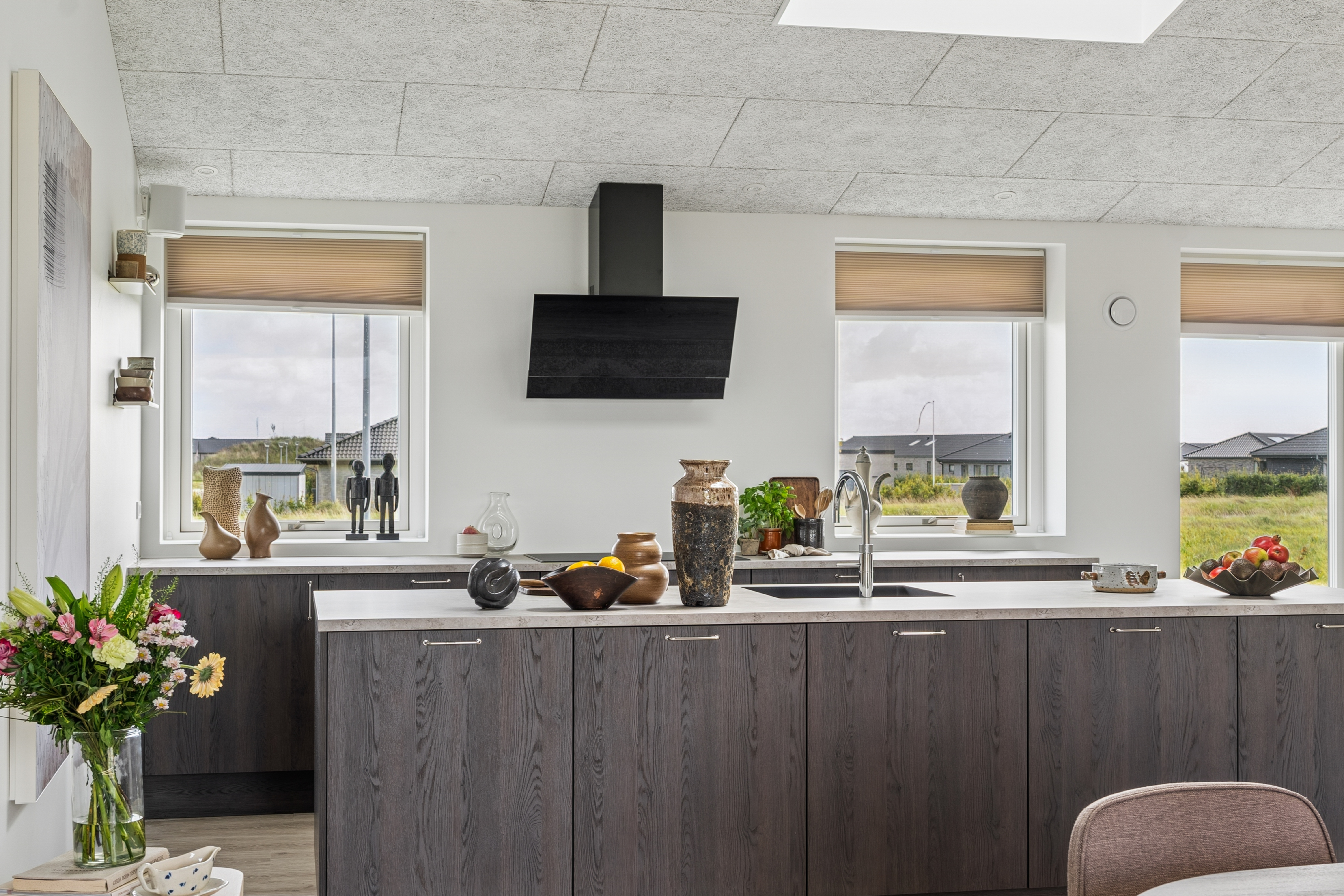 Stort køkken-alrum med ovenlys og hyggelig alkoveløsning