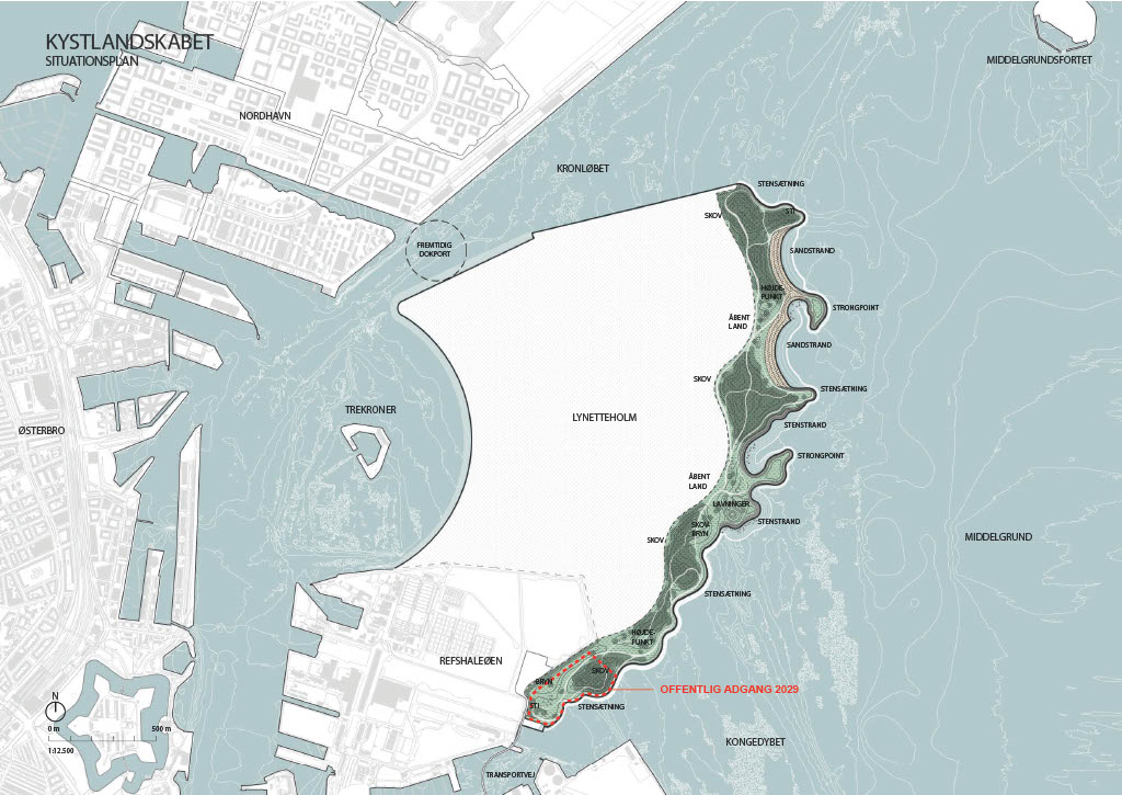 Første etape af kystlandskabet åbner i 2029 og er på cirka otte hektar. Når det samlede kystlandskab er færdigetableret, bliver det ca. 60 hektar, hvilket er på størrelse med Fælledparken.