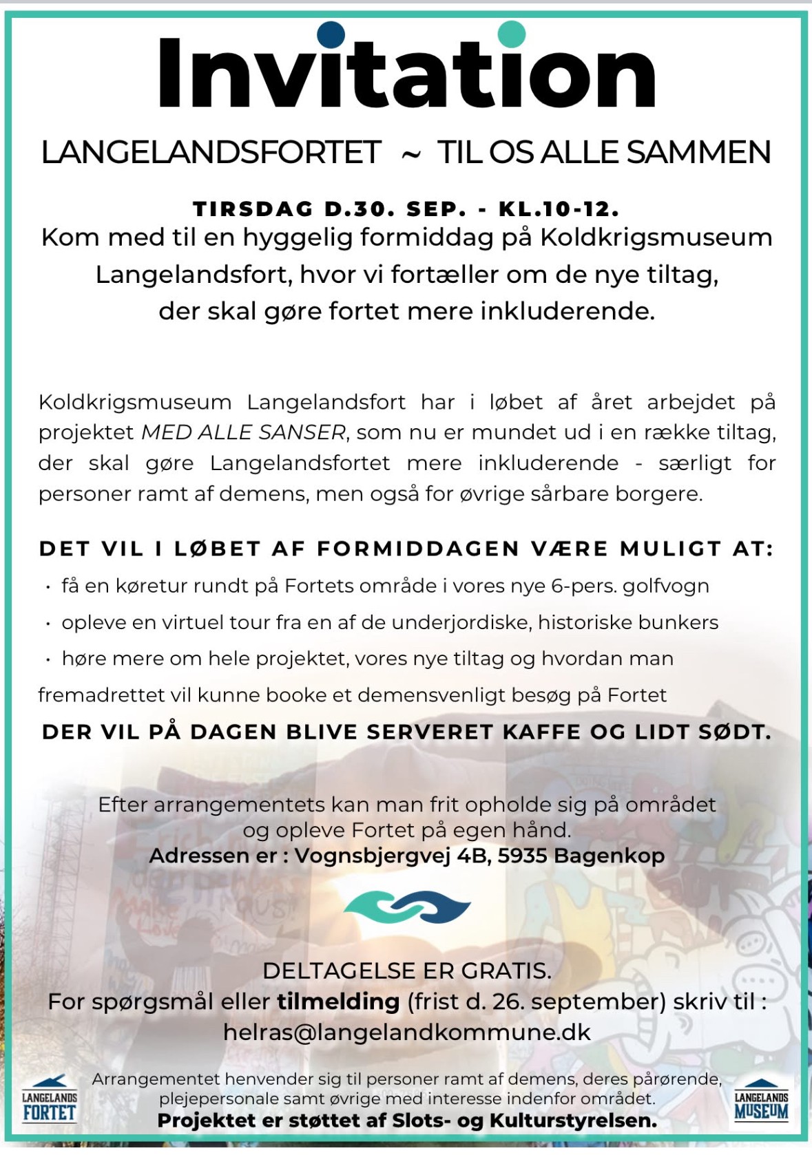 Tirsdag den 30. september lanceres de nye tiltag, der det sidste års tid er blevet arbejdet på i forbindelse med projektet "Med Alle Sanser", og som skal være med til at gøre Koldkrigsmuseum Langelandsfort mere inkluderende.