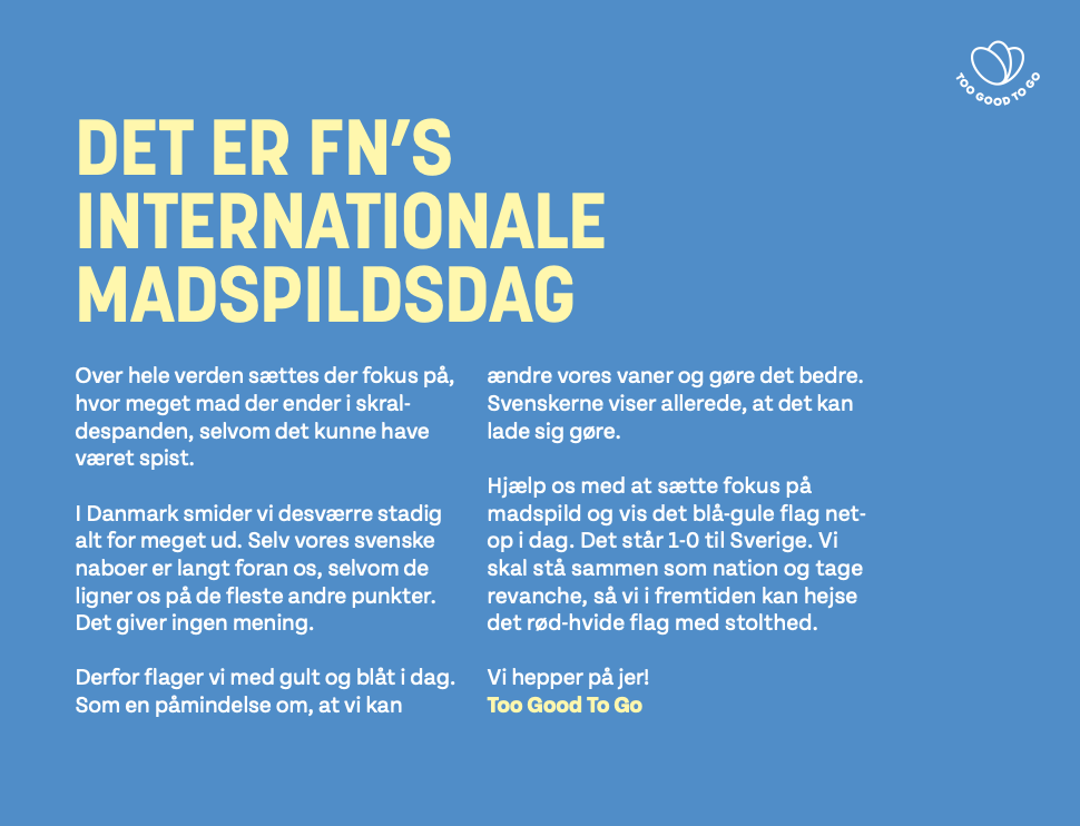 For at skabe fokus på problematikken, sætter Too Good To Go madspild på dagsordenen på FNs Internationale Madspildsdag ved at uddele svenske flag og opfordre alle, fra politikere til privatpersoner, til at sætte det svenske flag i vinduet som en markering på madspildsdagen. I følge Ken Vanhoegaerden, Too Good To Gos landedirektør i Danmark, skal der nytænkende metoder til at minde danskerne om, hvor grelt det egentlig står til, og hvor meget danskerne faktisk smider ud: