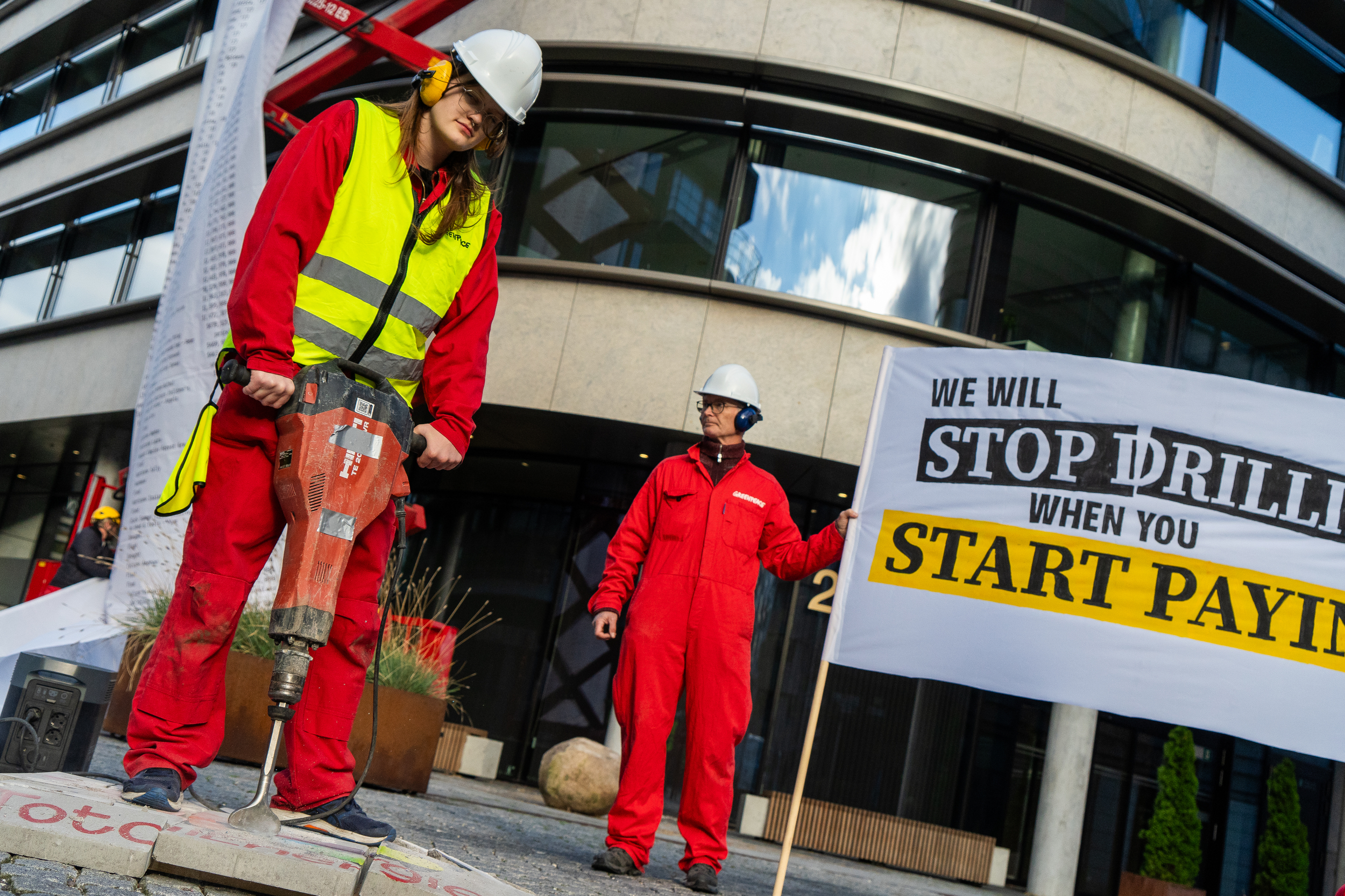 “Vi er i gang med en slags prøveboring. Vi prøver nemlig at se, om vi kan nå ned til nogle af TotalEnergies mange penge. Det er på tide, at de begynder at betale for de klimaskader, de er skyld i. Vi lover, at vi stopper med at bore, liiige så snart Total begynder at betale,” fortæller en af Greenpeace-aktivisterne, Annika Lesanner, mens hun borer ned i nogle betonfliser med TotalEnergies logo.
