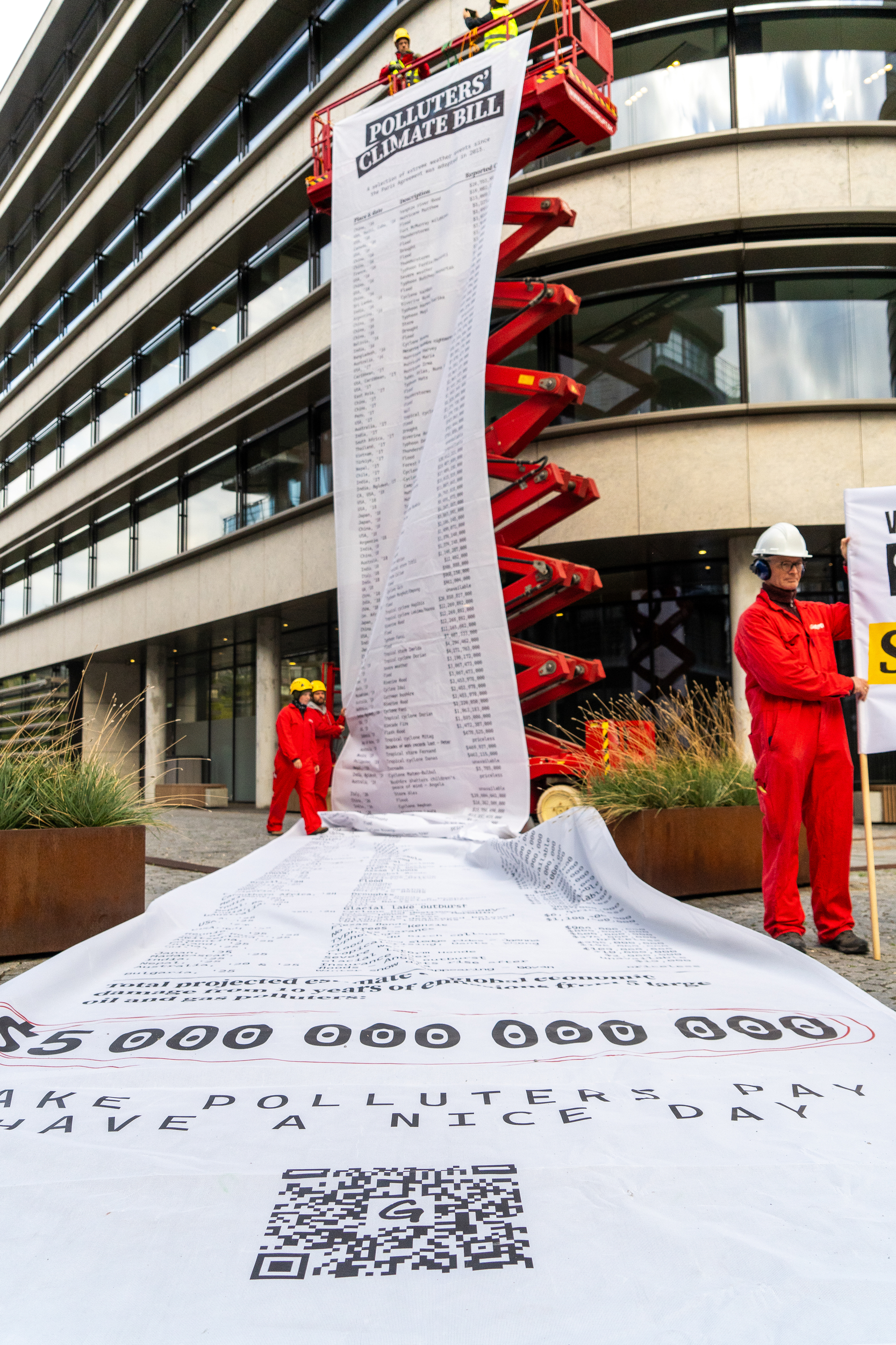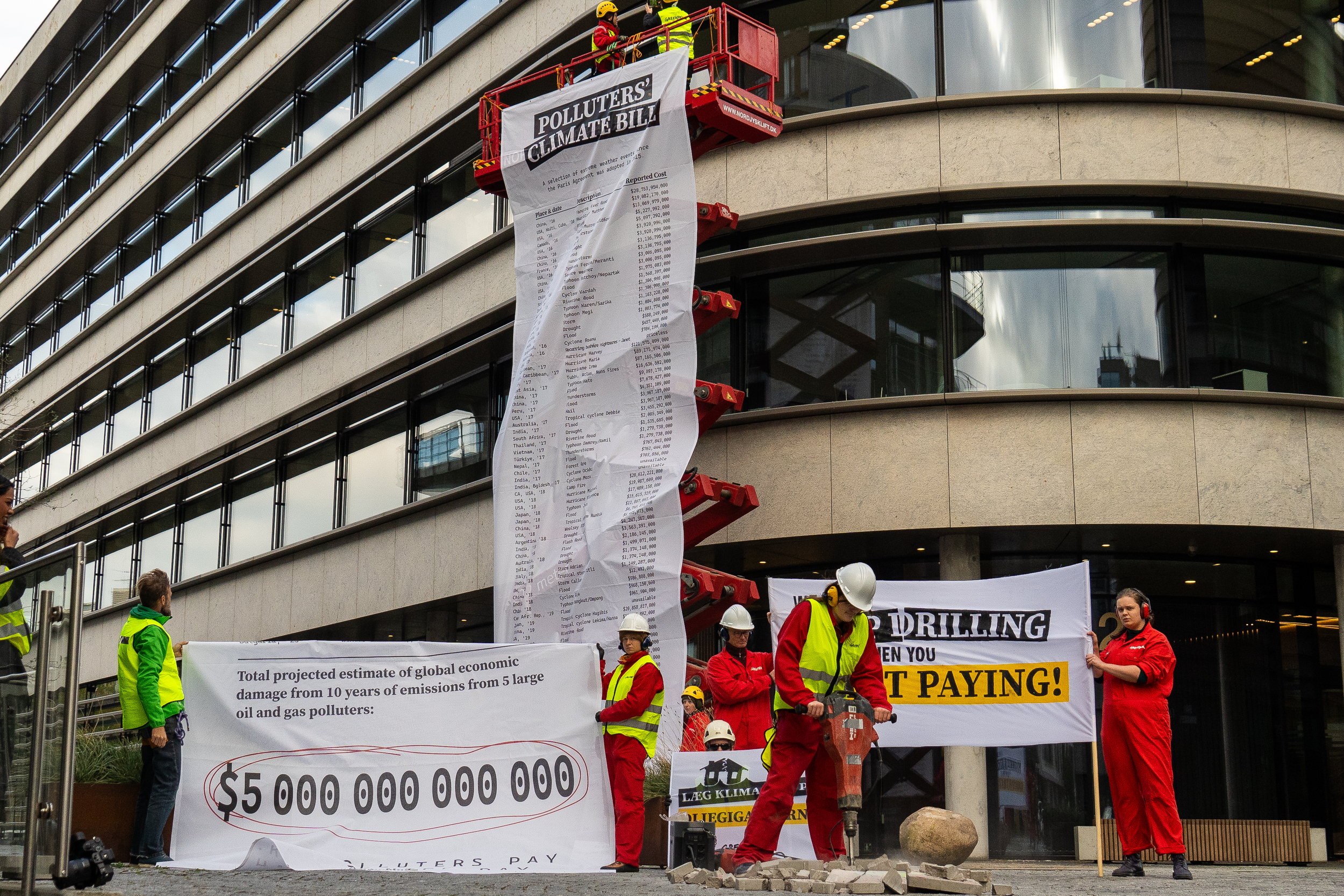 Med borelarm og en gigantisk klimaregning hængende fra en 20 meter høj sakslift, afleverede Greenpeace-aktivister her til morgen en tydelig besked til TotalEnergies og de andre oliegiganter: “Det er på tide at forurenerne tager regningen!”