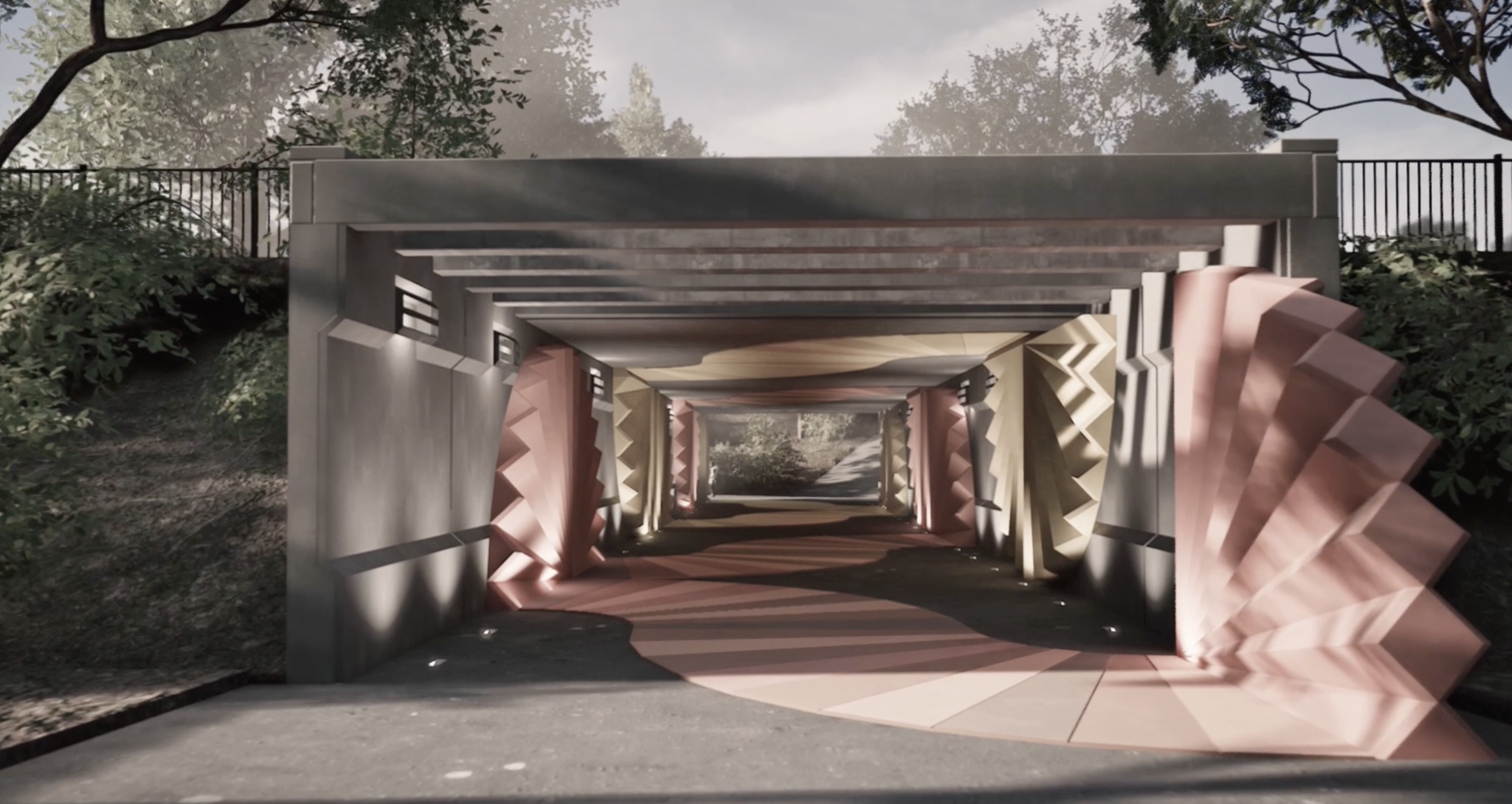 Kunstværket Vores Veje Mødes er skabt af billedkunstner Eva Steen Christensen og realiseret i et samarbejde mellem Esbjerg Kommune og Statens Kunstfond. Inspireret af noget så enkelt som papirservietter og musetrapper har Eva Steen Christensen skabt et legende og dynamisk univers, hvor farver og former mødes på tværs af tunnelen. Resultatet er en stærk æstetisk oplevelse helt i tråd med kvarterets udvikling.