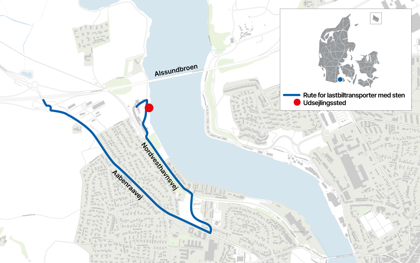 Stenene bliver leveret til Sønderborg med lastbil, hvor efter de bliver læsset over på en pram/udlæggerfartøj og til sidst sejlet ud til pillerne på Alssundbroen. Det betyder ekstra lastbilkørsel ad Nordvesthavnsvej i Sønderborg særligt i perioden den 6.-den 10. oktober.