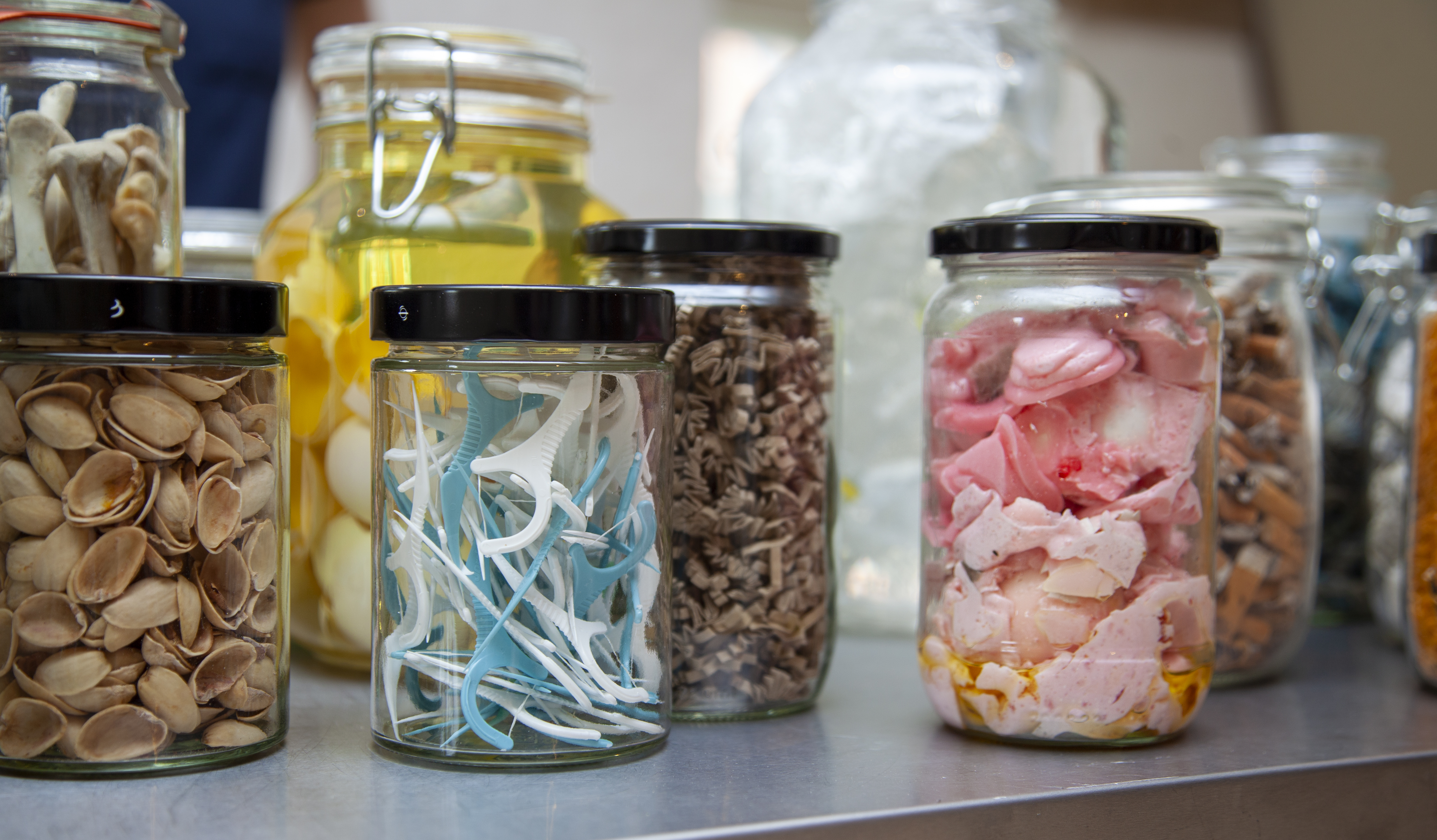 Heldigvis får en del af udstillingens 400 syltetøjsglas med alt fra forfædres potteskår til nutidens mundbind og mikroplast nyt liv hos forsyningsselskabet Fors og Frederiksberg Kommunes Genbrugsguider.