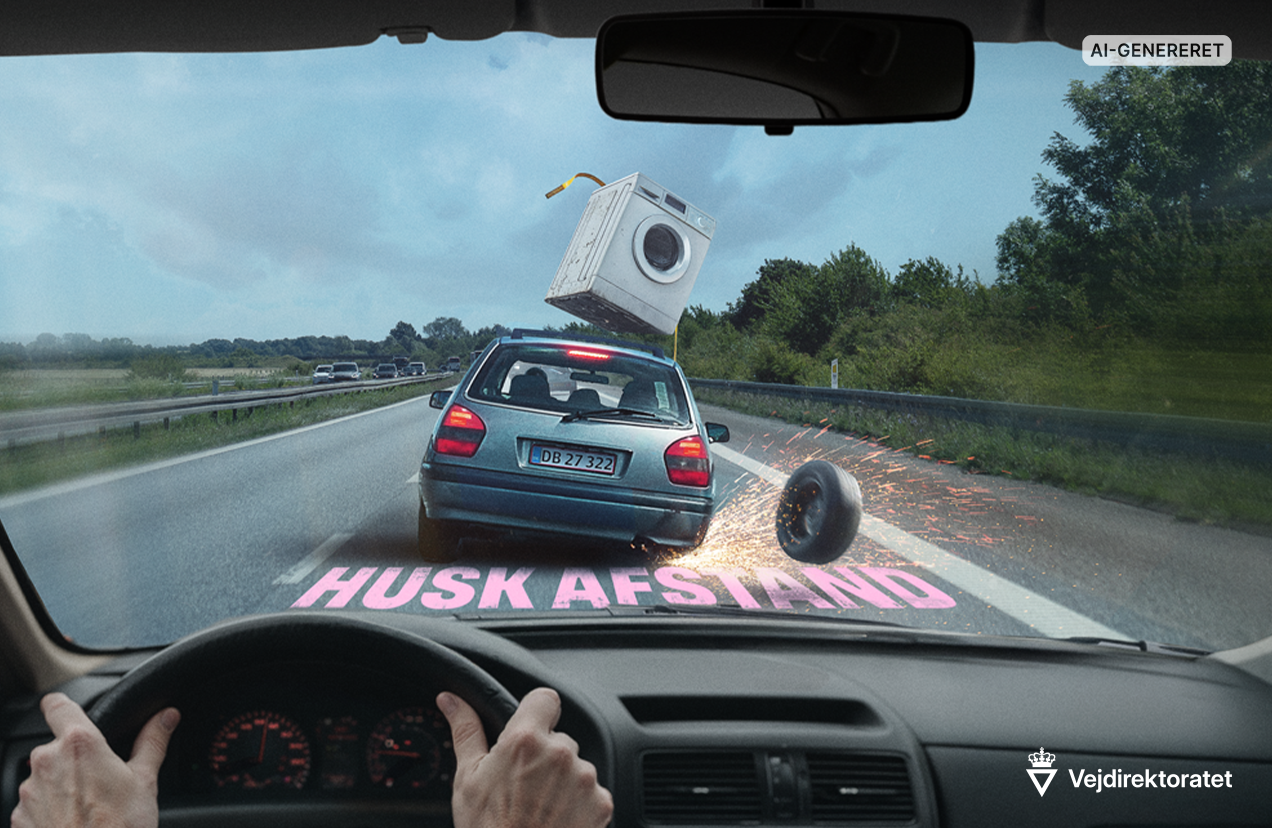 Vejdirektoratet lancerer den nye kampagne onsdag den 8. oktober. Kampagnen består af en række billeder, der er skabt med kunstig intelligens og billedbehandling. Billederne viser nogle ekstraordinært dramatiske situationer på motorvejen og skal illustrere, hvor hurtigt det kan gå galt, hvis man ligger for tæt på bilen foran.