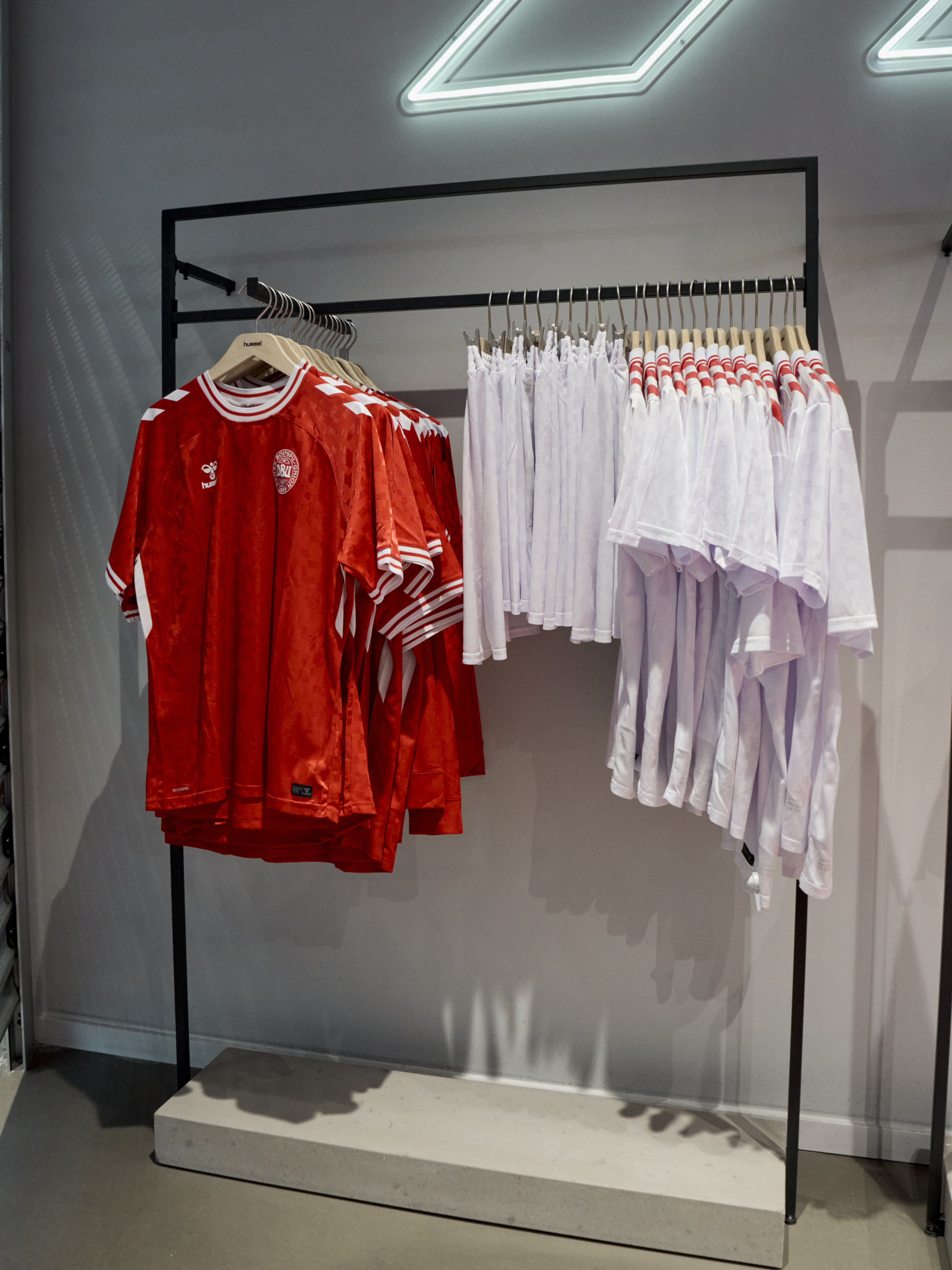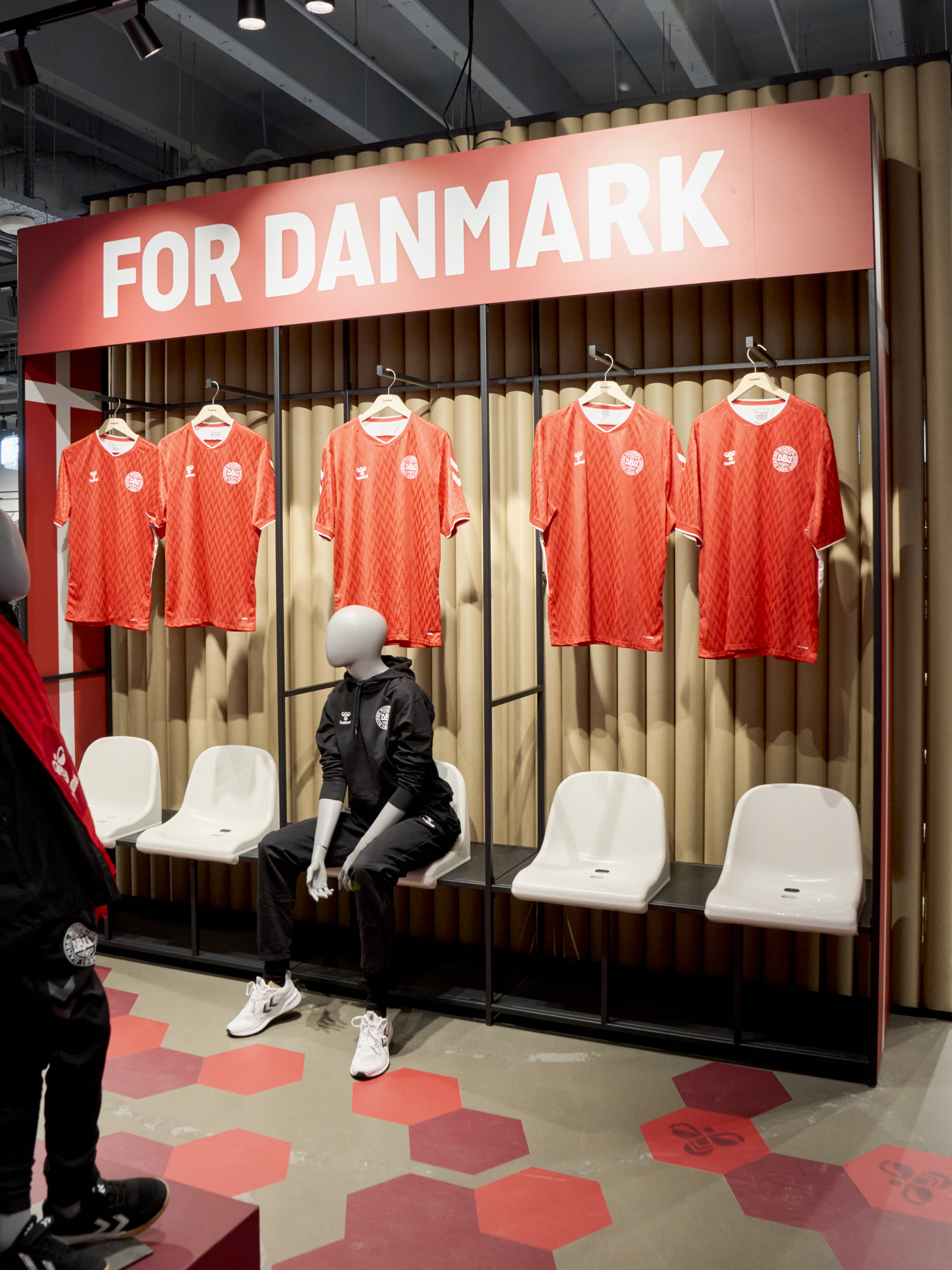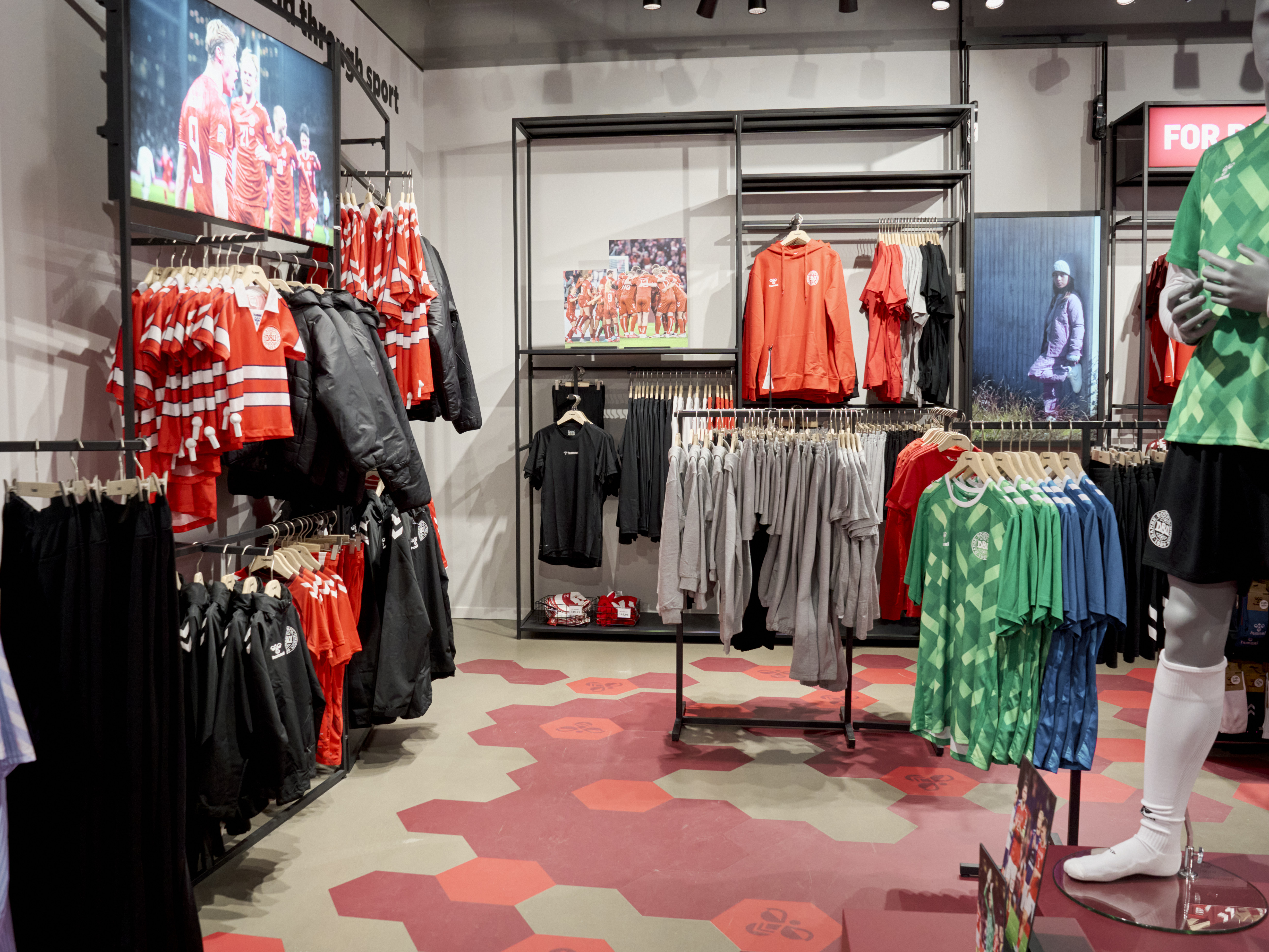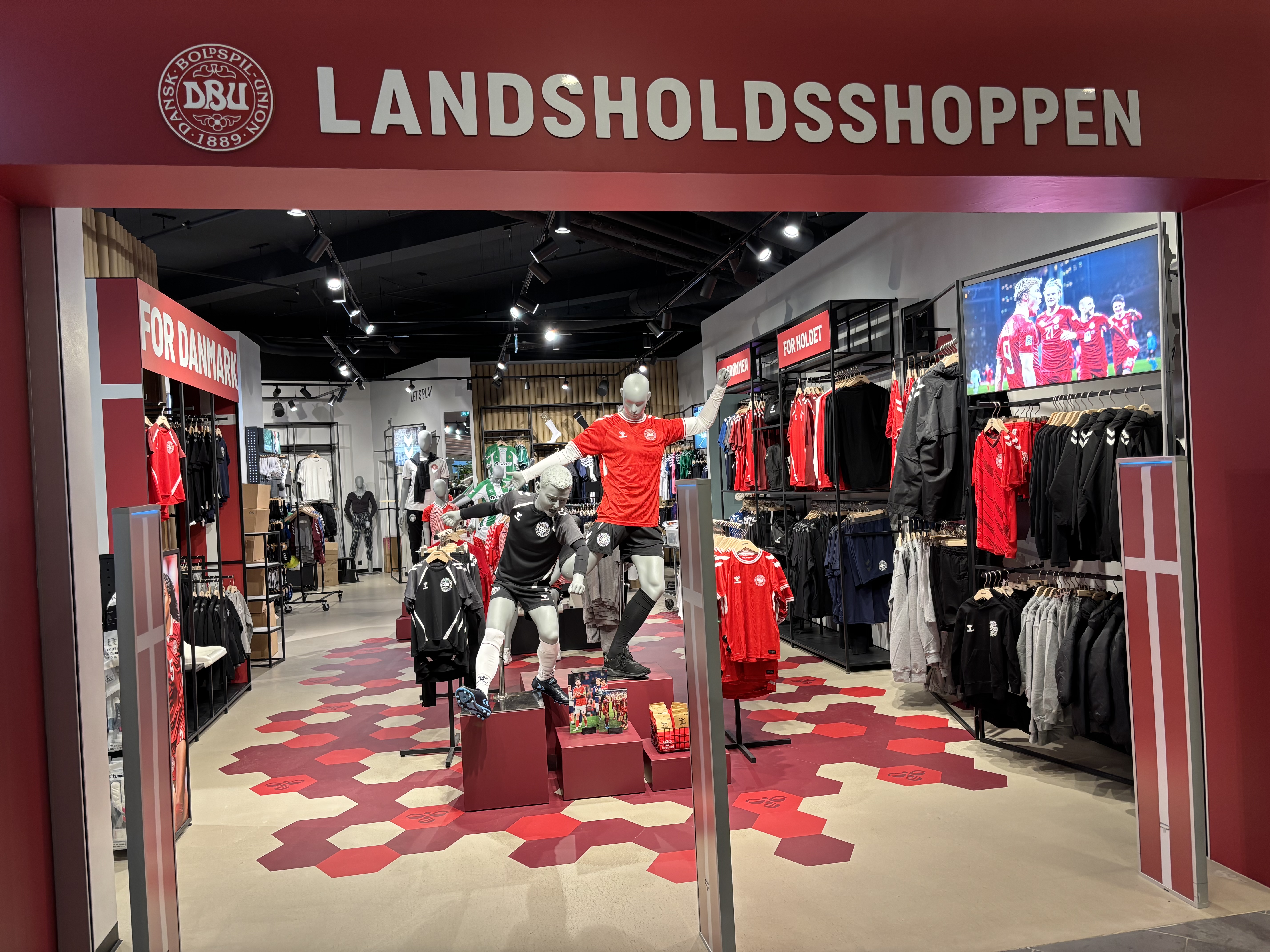 I Aarhus åbner den største afdeling på 77 m2, mens Odense og Frederiksberg får afdelinger på 55 m2. Her kan fans finde alt fra den nyeste landsholdstrøje til ikoniske klaphatte og fanmerchandise i rød-hvide farver.