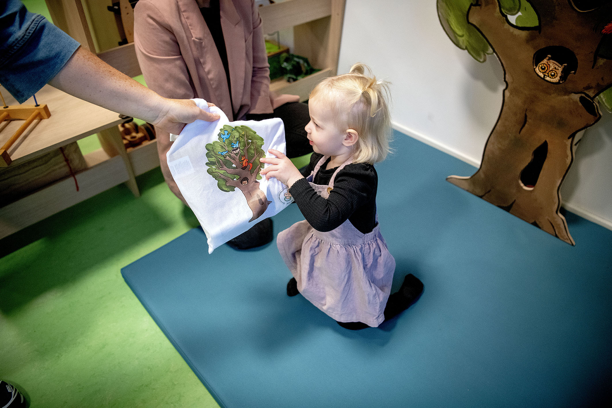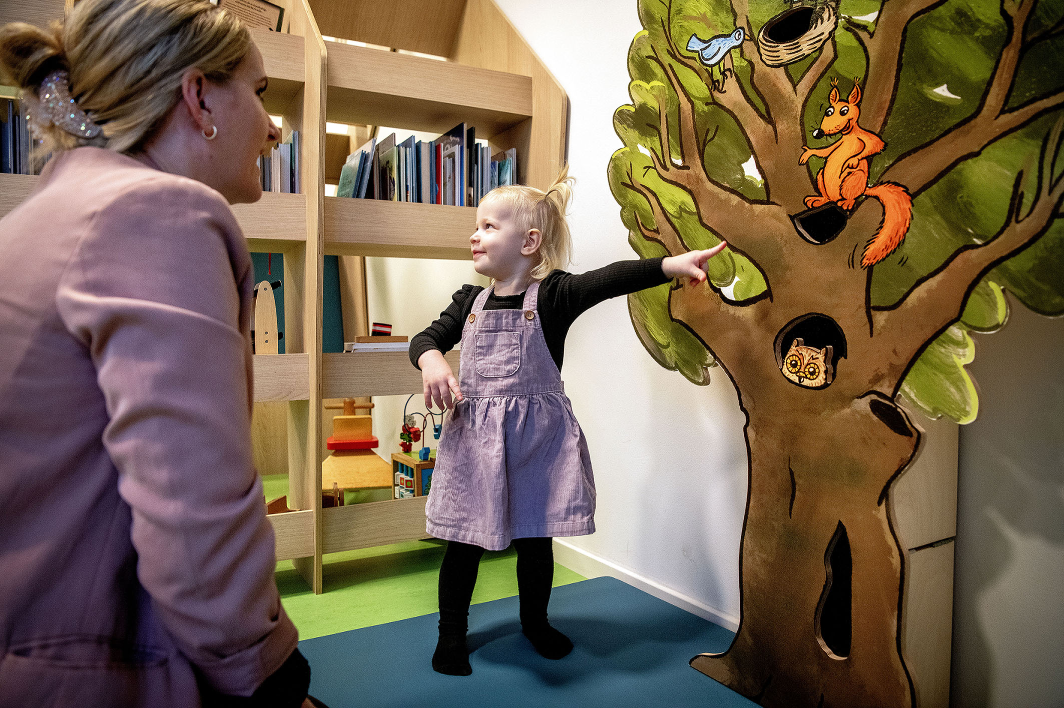 "Jeg synes, det er en virkelig god idé," siger Line Willadsen Schmidt, som er mor til toårige Laura, mens datteren peger nysgerrigt på træet, hvor en ugle kigger frem, et egern vinker og fugle synger.