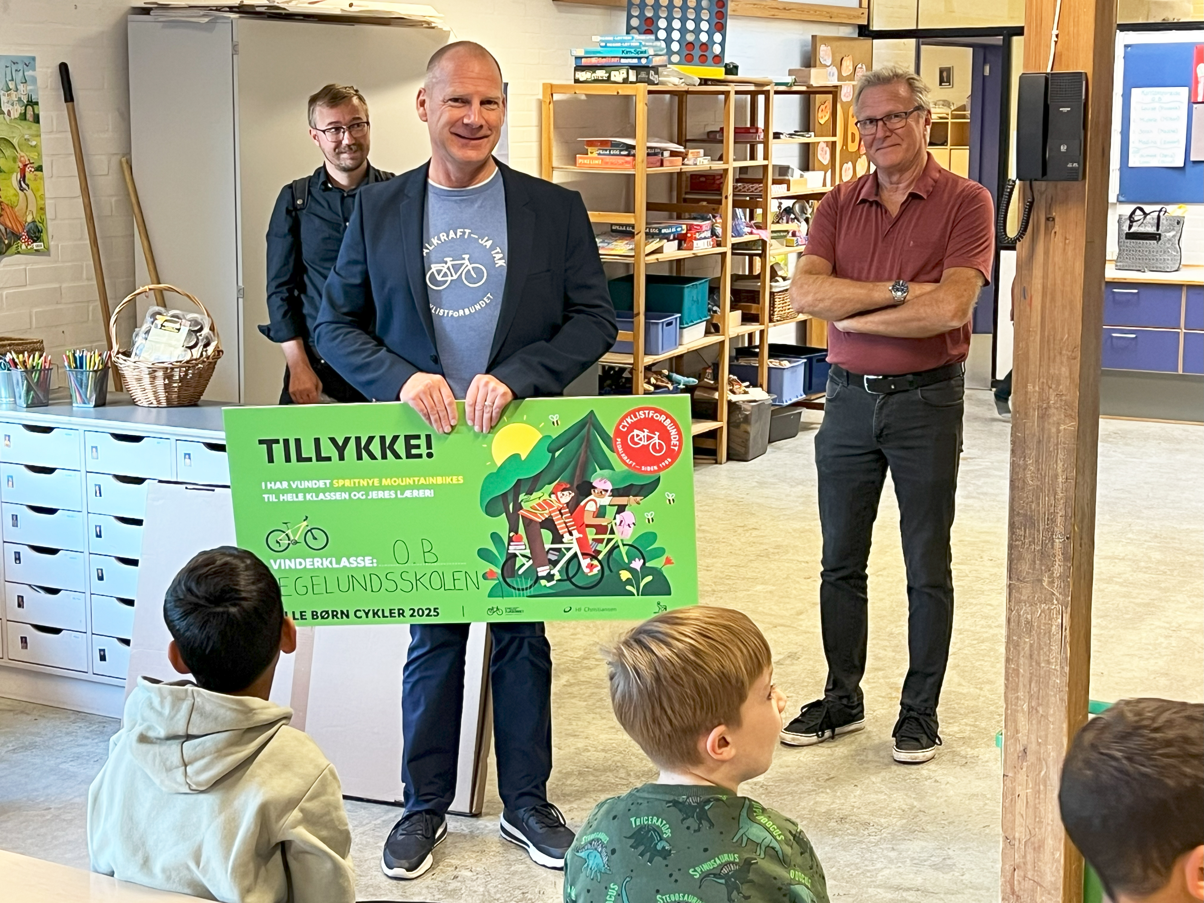 På Egelund Skole i Albertslund kan 0. B glæde sig over spritnye cykler til hele klassen og deres lærer, sponsoreret af HF Christiansen. Klassen vandt hovedpræmien i lodtrækningen, hvor chancen for at vinde var større, jo mere man cyklede. Borgmester i Albertslund, Steen Christiansen (S) overraskede klassen sammen med Cyklistforbundet og uddelte præmien.