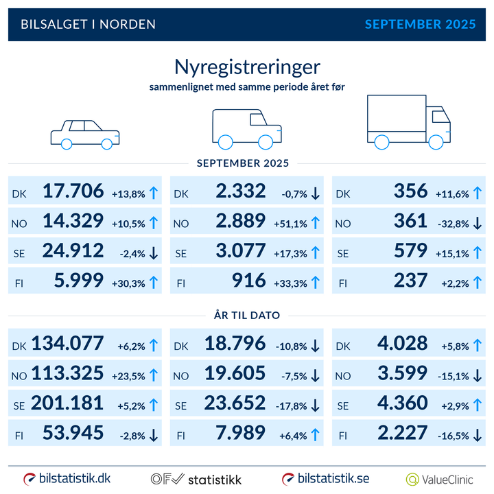 Elbilerne sætter for alvor kursen i Norden, hvor Norge igen topper med en elbilandel på 98,3 procent af nyregistreringerne i september. Danmark følger stærkt efter med 73,4 procent, den højeste andel nogensinde, mens Finland og Sverige når 43,2 og 38,6 procent. Udviklingen viser, at elektrificeringen fortsat accelererer på tværs af Norden, men også at Norge fastholder sin position som foregangsland for den grønne omstilling. Norges elandel er et resultat af en kombination af forskellige økonomiske incitamenter, herunder lav eller ingen registreringsafgift på elbiler. Det viser, at den rette politiske opskrift virker.