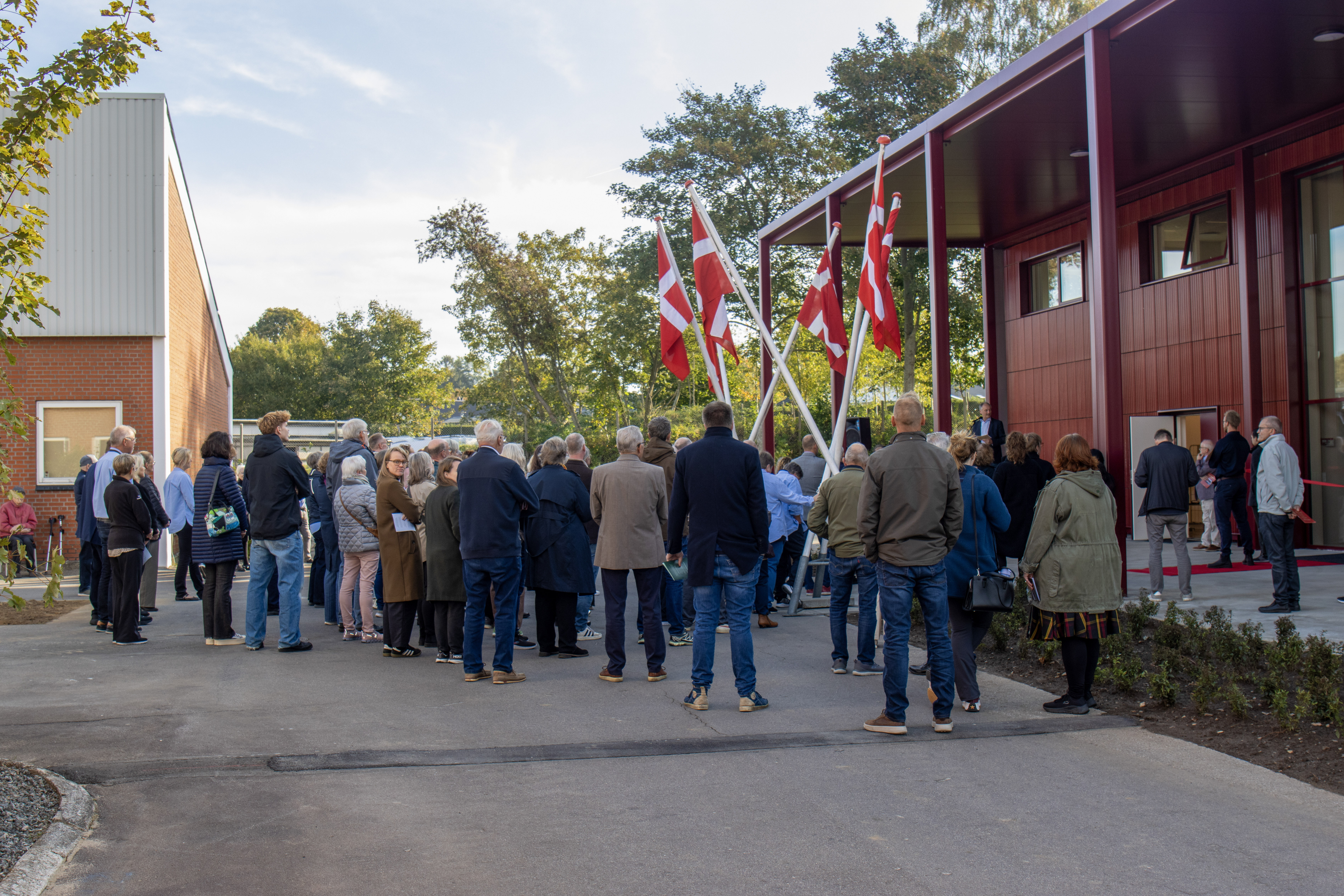 Ca. 120 gæster står i solskinnet foran Historie Haderslevs nye Formidlings- og magasinbygning.