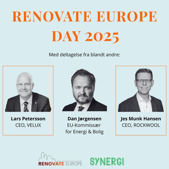 Den 3. november samler SYNERGI, Renovate Europe og nogle af Europas førende virksomheder centrale beslutningstagere i København til en konference, der sætter fokus på, hvordan energieffektive renoveringer kan være en gamechanger for EU’s konkurrenceevne, klimakamp og energiuafhængighed. EU-kommissær Dan Jørgensen holder hovedtalen og vil være til rådighed for pressen. Det samme vil bl.a. CEO’s i ROCKWOOL, VELUX og Hansgrohe. På konferencen får kommissæren også præsenteret 'Copenhagen Commitment' – en erklæring, hvori europæiske producenter af energieffektive produkter og teknologier melder sig parate til at investere yderligere i medarbejdere og produktion for at nedbringe omkostningerne i bygninger og styrke konkurrenceevnen.