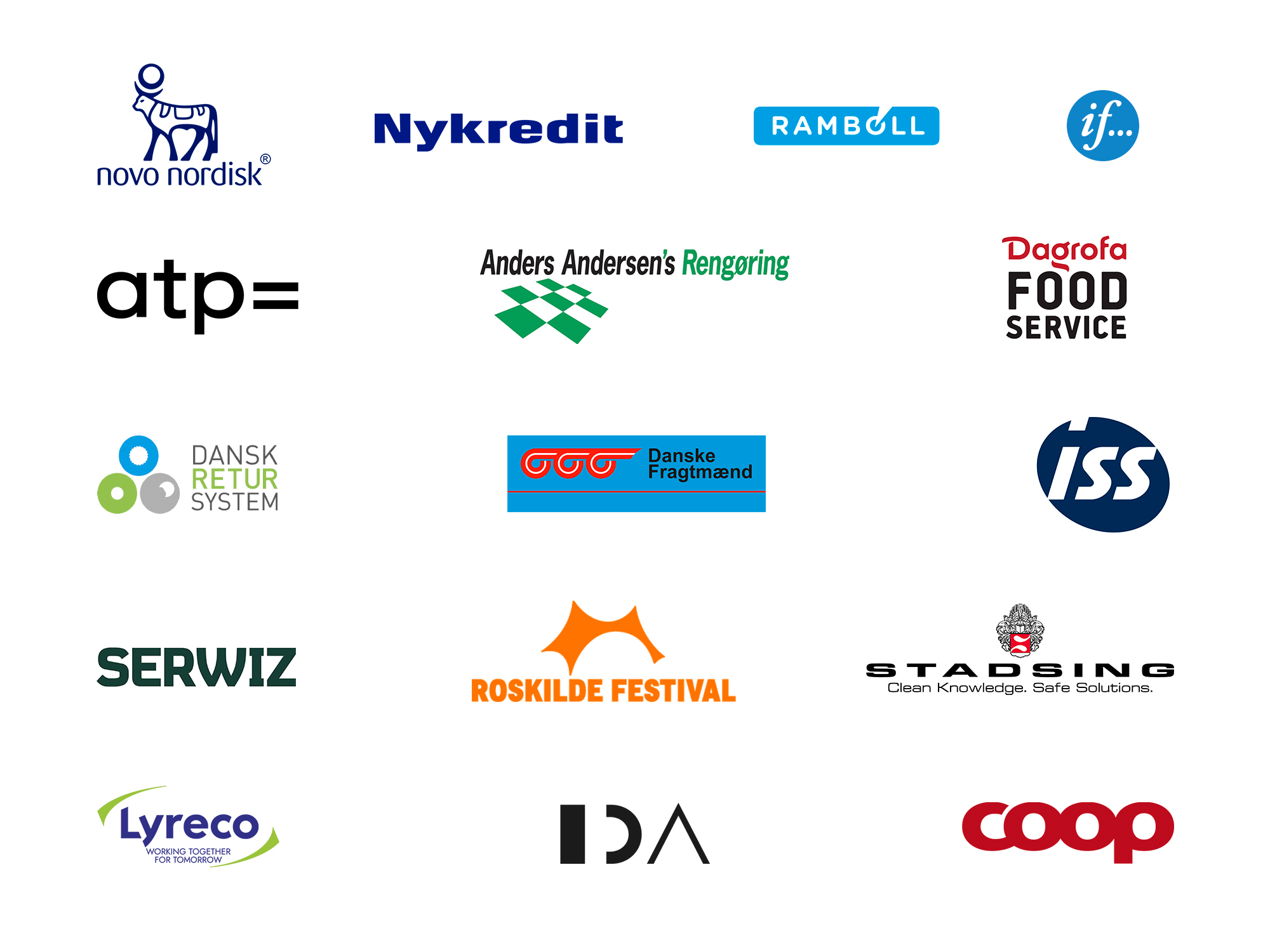 Netværkets medlemmer består i dag af: Novo Nordisk, IF Skadeforsikring, Rambøll, Nykredit, Dansk Retursystem, Lyreco, Anders Andersens Rengøring, Coop, ISS, Stadsing, Roskilde Festival, IDA, ATP, Dagrofa Food Service, Danske Fragtmænd og Serwiz.