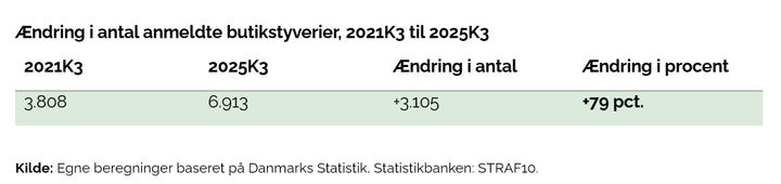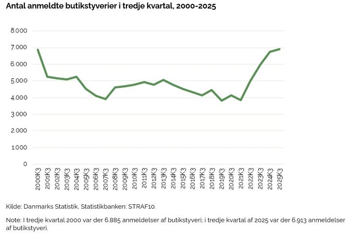 Mens den generelle kriminalitet i Danmark er faldet med cirka 30 procent over de seneste 20 år, er antallet af anmeldte butikstyverier steget med over 50 procent. Særligt siden 2021 er udviklingen eksploderet – i tredje kvartal 2025 blev der anmeldt 6.913 butikstyverier mod 3.808 i samme periode 2021, en stigning på 79 procent.