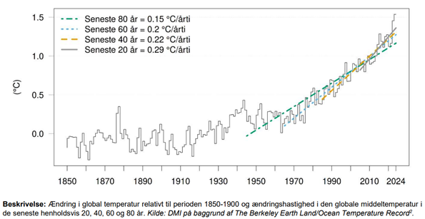 I 2024 lå den gennemsnitlige globale temperatur 1,55 °C over niveauet fra 1850–1900 – den højeste årlige gennemsnitstemperatur, der nogensinde er målt. Nye beregninger sætter rekorden i et længere tidsperspektiv, og viser, at opvarmningen er steget fra 0,15 °C per årti over de seneste 80 år til 0,29 °C per årti de seneste 20 år. Opvarmningen per årti er altså næsten for fordoblet.