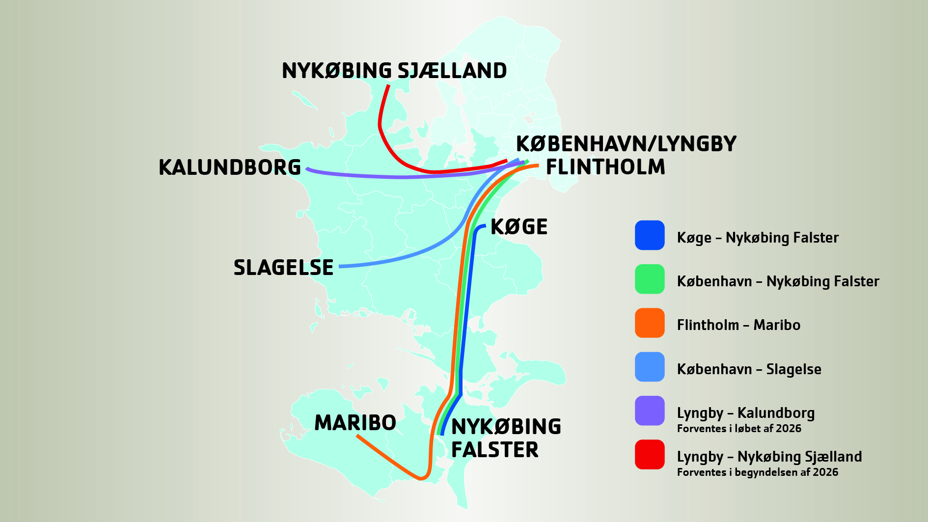 I dag onsdag den 29. oktober kommer den første af de nye, planlagte ruter på landevejen. Den kommer til at køre fra Flintholm Station på Frederiksberg til Maribo på Lolland. De to øvrige til Kalundborg og Nykøbing Sjælland kommer efter planen til at køre fra Lyngby. Ruterne vil løbende blive tilpasset efter behov.