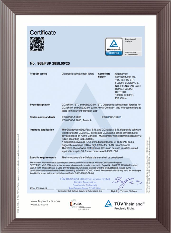 GigaDevice GD32F5xx and GD32G5xx Software Test Libraries (STL) Receive TÜV Rheinland IEC 61508 Functional Safety Certification