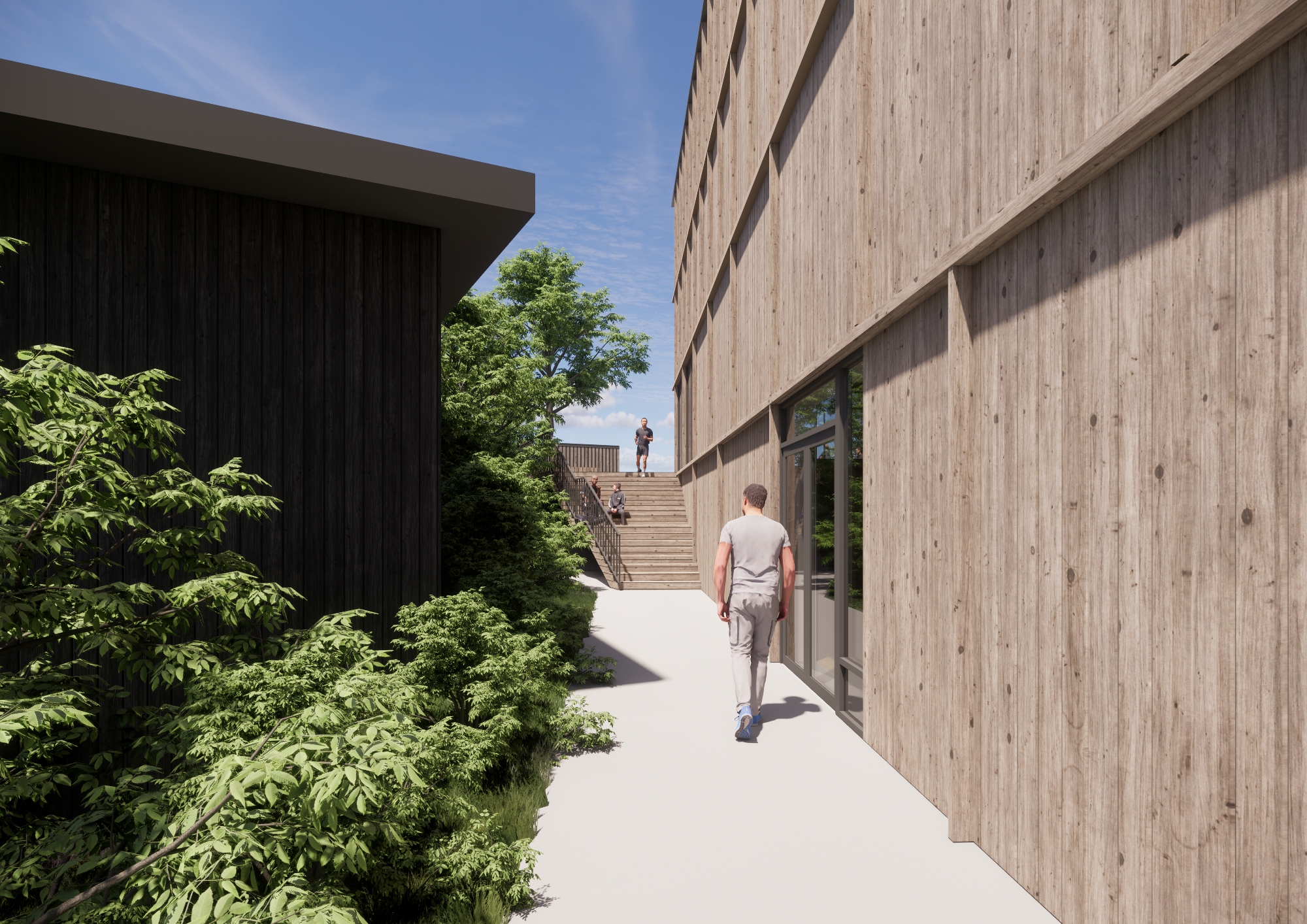 Fra velkomsttorvet etableres en ny trappeforbindelse ned til terræn, hvilket kobler de udendørs træningsområder sammen med både ankomstpladsen og den indvendige gade, der etableres mellem hal 2 og 3.