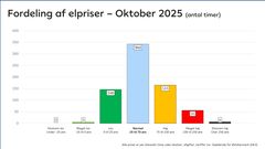 Månedens højeste timepris oplevede elkunderne onsdag d. 29. oktober i timen mellem kl. 6 og 7 om morgenen. Her var prisen per kilowatt-time helt oppe i ca. 304 øre per kilowatt-time før skatter, nettariffer mv. Til sammenligning var månedens billigste time helt nede i minus 1,4 øre. Altså en forskel på mere end 305 øre.