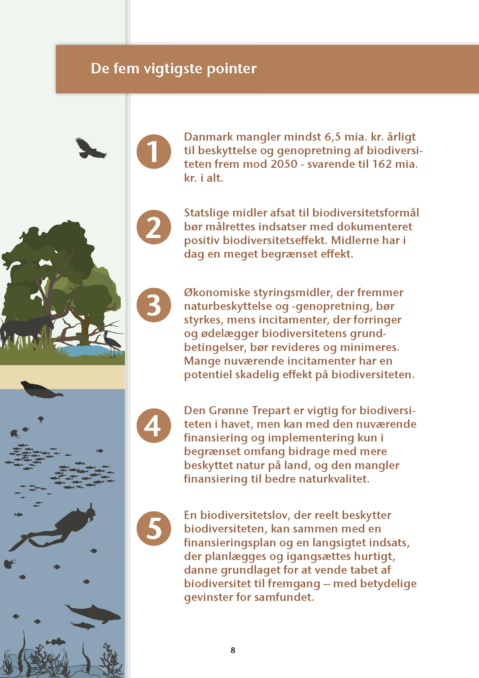 • Danmark mangler mindst 6,5 mia. kr. årligt til beskyttelse og genopretning af biodiversiteten frem mod 2050 – svarende til 162 mia. kr. i alt.