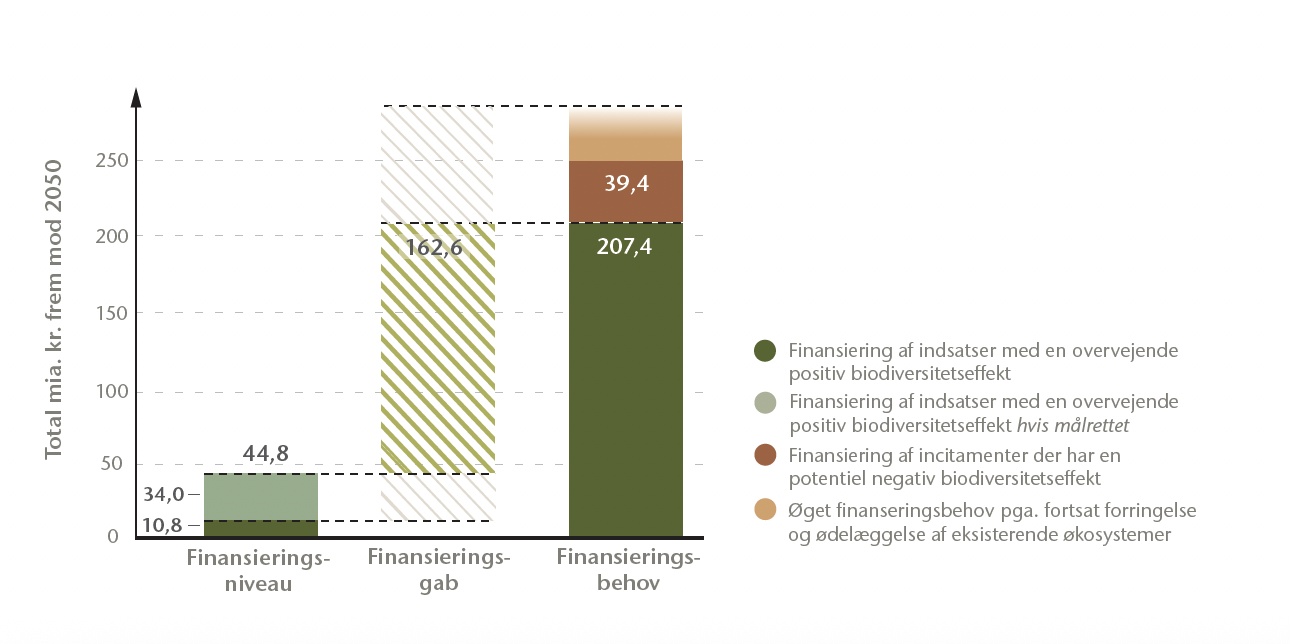 Rapporten estimerer, at der er behov for mindst 207 mia. kr. frem mod 2050 for at skabe det minimale – men ikke nødvendigvis tilstrækkelige – grundlag for at vende tabet af biodiversitet til fremgang.