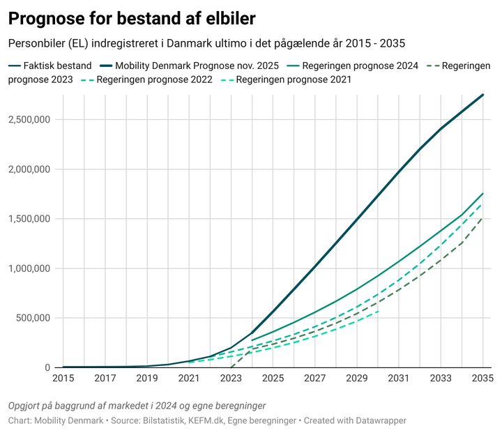 Der vil allerede i 2027 være en million personbiler, der kører på el, i Danmark. Det viser en ny prognose fra Mobility Denmark, der skruer op for forventningerne til elbilernes udvikling.