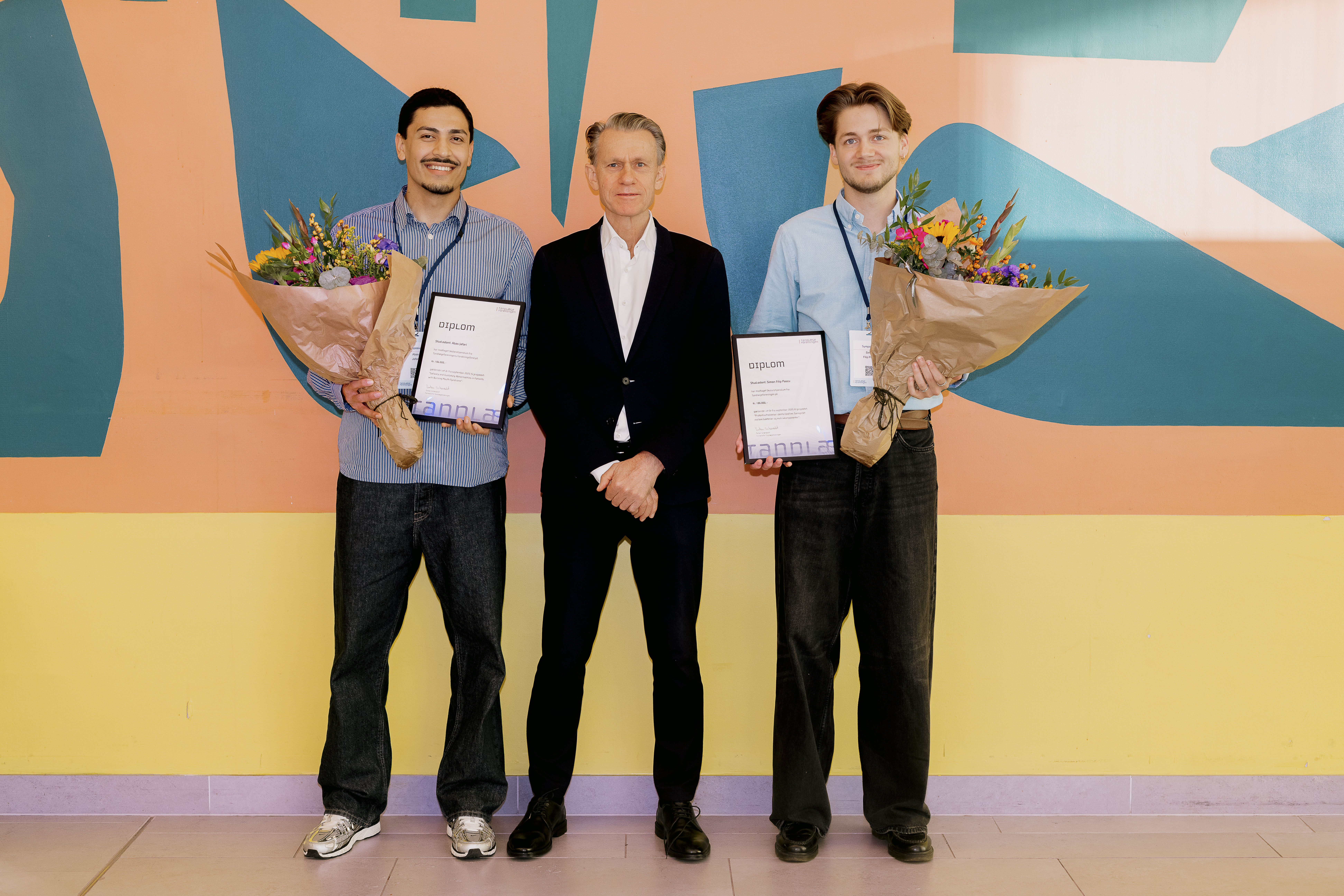 Abas Jafari og Simon Filip Pascu modtog skolarstipendierne af Tandlægeforeningens formand, Torben Schønwaldt, ved Tandlægeforeningens symposium den 7. november i Aalborg Kongres & Kultur Center. Her var over 1.000 tandlæger, tandplejere og klinikassistenter samlet for at blive klogere på den akutte patient.