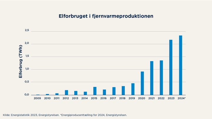 Fjernvarmesektoren har rundet et elforbrug på 2 TWh om året, svarende til samme årlige strømforbrug for over en halv million husstande. Det er en vigtig milepæl i elektrificeringen og den grønne omstilling af varmeproduktionen i Danmark.