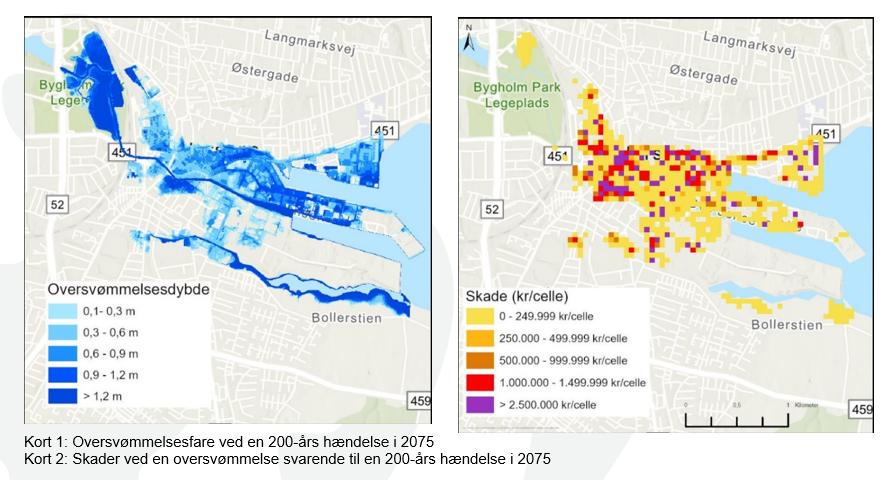 - De forventede skadesomkostninger estimeres med betydelig usikkerhed at kunne løbe op i omkring 550 millioner kroner over de næste 80 år, og risikoen stiger i takt med klimaændringerne.