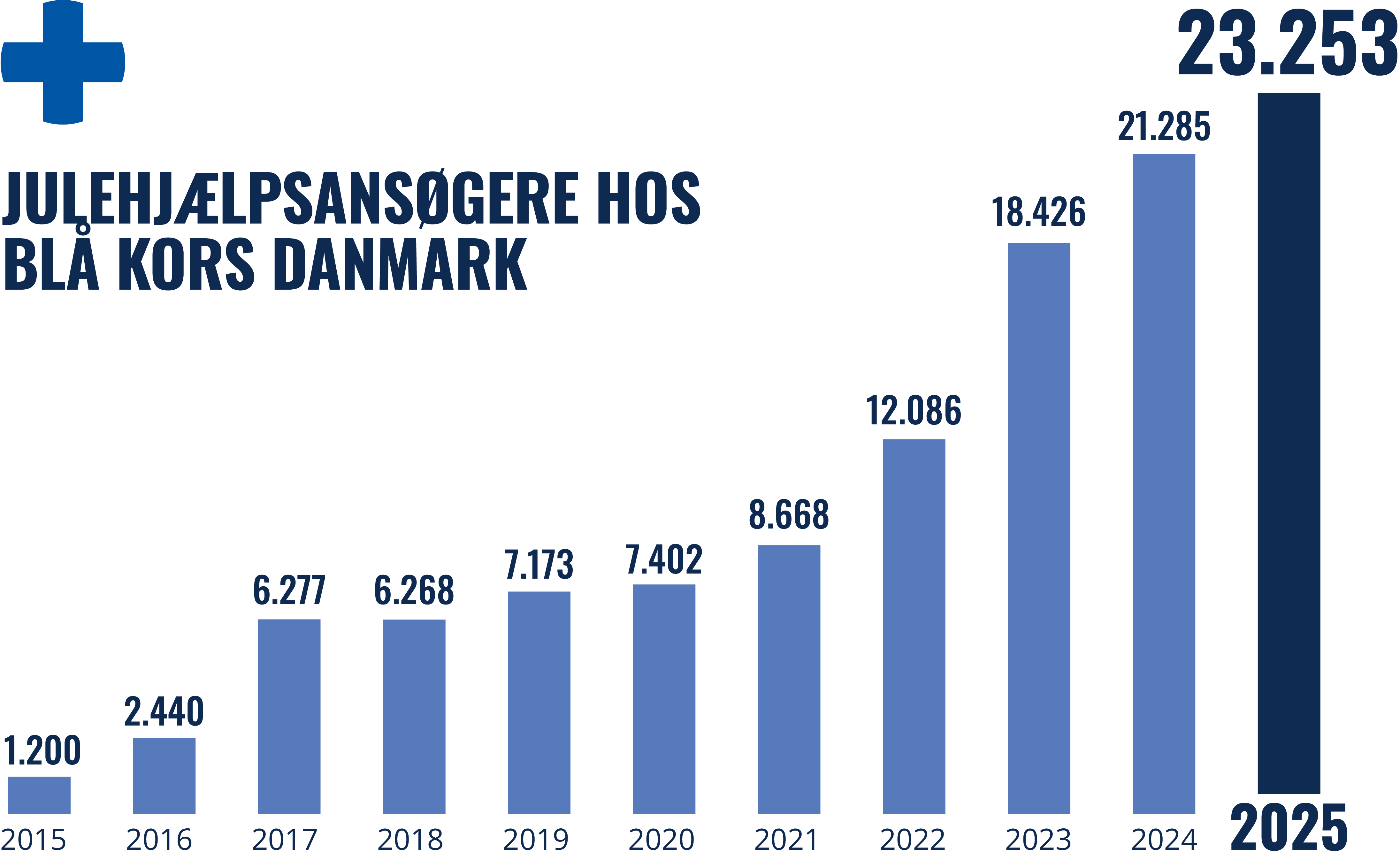 Blå Kors Danmark har nu lukket for ansøgninger til årets julehjælp, og aldrig før har så mange familier rakt ud efter hjælp. I alt har 23.253 familier søgt om julehjælp, hvilket er næsten 2.000 flere end sidste års rekord på 21.285 ansøgninger.