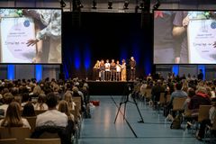 En sal fuld af energiske 6. og 7. klasses skoleelever og deres stolte lærere skabte en kæmpe idéfest i DGI Huset i Vejle til Danmarks Entreprenørskabsfestival.