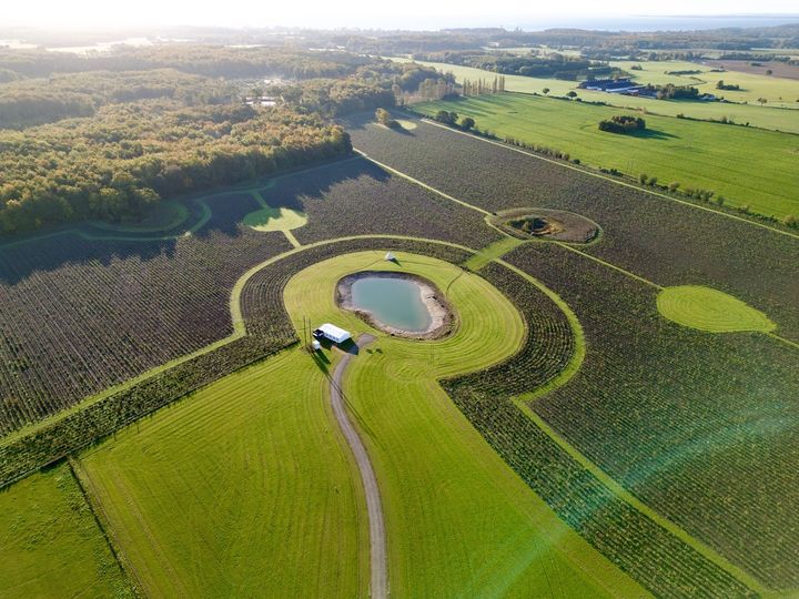 Fra gården løber der en sti forbi søen og hele vejen rundt i skoven, hvor der primært er plantet løvtræer og -buske iblandet mindre skovstykker med nåletræer.