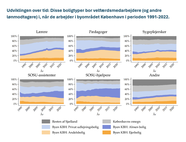 Figuren viser andelene af hver faggruppe og resten af arbejdsmarkedet med arbejdsplads i Byen København som bor i Byen København, og herunder i hvilke boligtyper, i Københavns omegn og på resten af Sjælland over tid. Kilde: Egne beregninger på data fra Danmarks Statistik. ROCKWOOL Fonden