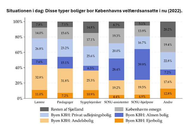 De enkelte faggruppe blandt velfærdsmedarbejdere og andre lønmodtagere, der arbejder på en adresse i København, er her delt op efter hvilke boligtyper, de bor i i byområdet København i 2022. Medarbejdere, der bor i Københavns omegn og på resten af Sjælland, er ikke inddelt på boligtype. Kilde: Egne beregninger på data fra Danmarks Statistik. ROCKWOOL Fonden