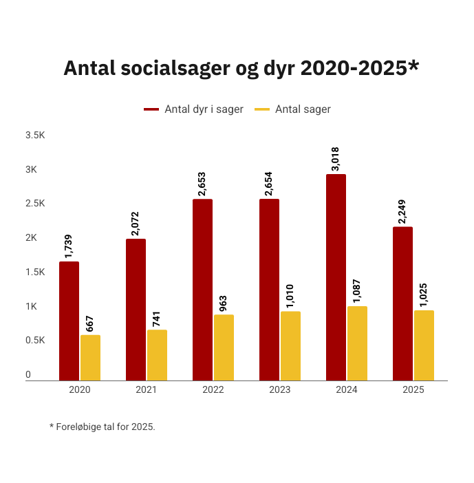 De er ofte forsømte, syge og i dårlig forfatning. Stadig flere dyr har brug for hjælp, når livet ramler for deres ejere. I 2024 rykkede Dyrenes Beskyttelses beredskab, som består af dyrlæger og frivillige dyrereddere, ud til hele 1.087 sager med i alt over 3.000 kæledyr. De foreløbige tal fra 2025 viser, at antallet fortsat ligger højt med over 1.025 socialsager.