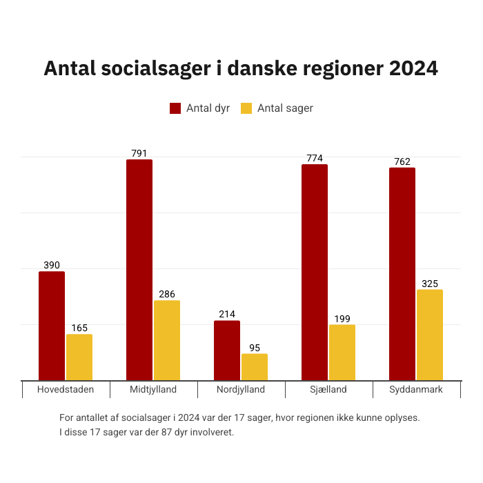 Særligt i Region Midtjylland, Region Sjælland og Region Syddanmark var der sidste år mange socialsager – med over 750 dyr involveret i alle tre regioner.