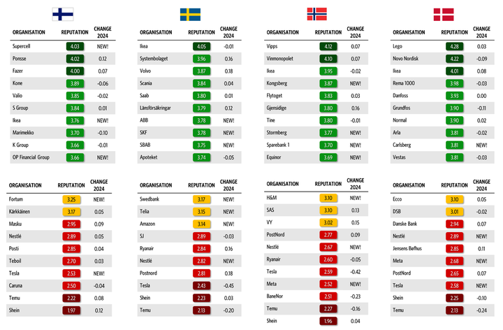 Reputation and Trust Analytics' Reputation&Trust 2025 study reveals that Denmark's most reputable company is Lego. At the bottom across all Nordic countries are ultra-fast fashion retailers Temu and Shein, and Tesla's reputation is also in steep decline.