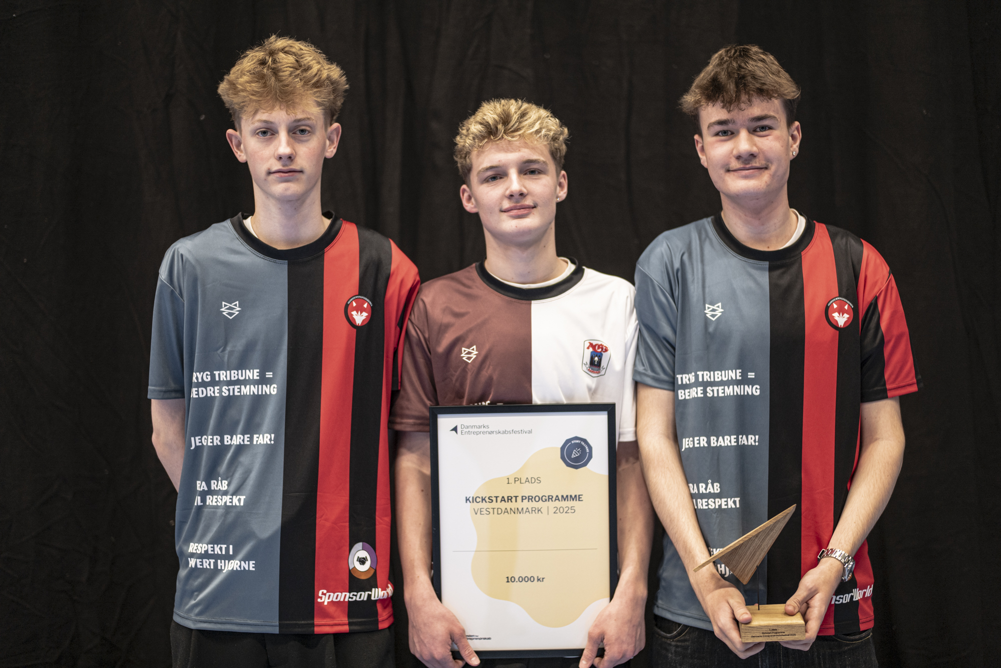 Vinderen af Kickstart Programme Victor, Søren og William fra Herningsholm med ideen SafeMathes, som har udivklet en løsning, der skal sikre et tryggere og mere venligt miljø under fodboldkampe gennem positive budskaber på fodboldtrøjer.