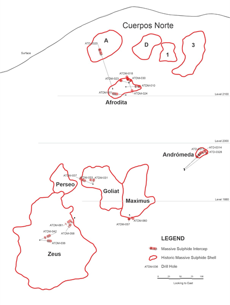 Image 1: Mineralized shells based on historical massive and new bodies at the El Roble Mine with intercepts from the current drill program