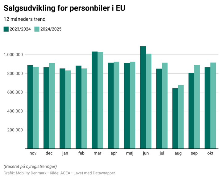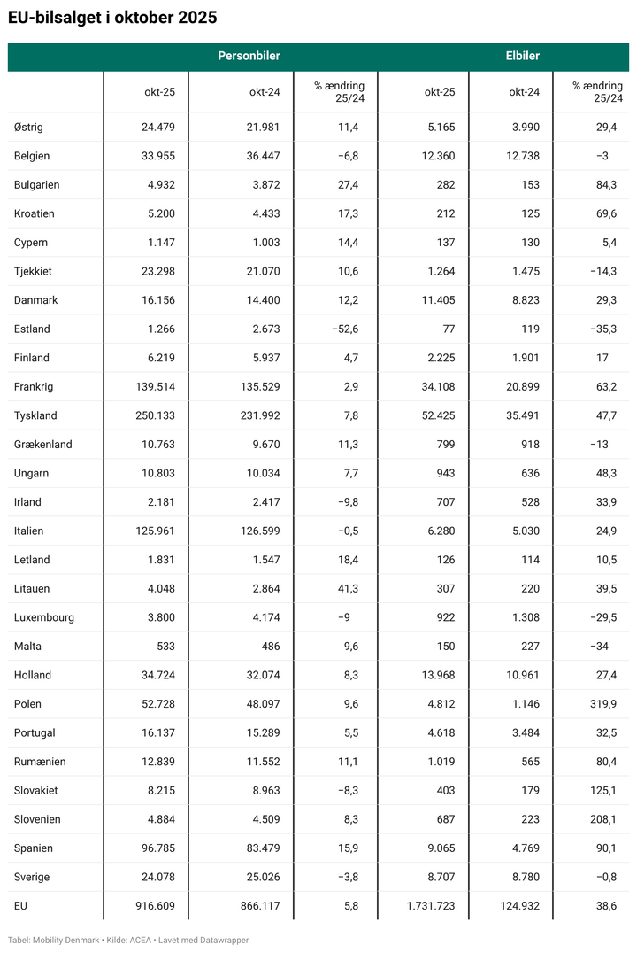 Der var endnu engang fremgang i det europæiske bilsalg i oktober 2025. I EU blev der i løbet af måneden indregistreret 916.609 nye personbiler, hvilket svarer til en stigning på 5,8 procent sammenlignet med oktober 2024, hvor 866.117 nye biler blev indregistreret. Over en længere periode har bilmarkedet i EU været meget stabilt, med en mindre fremgang på 1,4 procent år til dato sammenlignet med sidste år. I alt er der blevet indregistreret 8.974.026 nye biler i EU i de første 10 måneder af 2025.