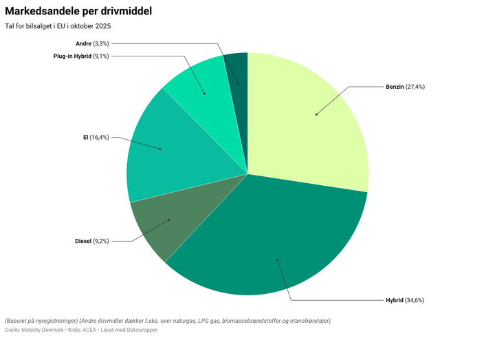 Antallet af nyregistrerede elbiler i EU steg i oktober, hvor 173.173 nye elbiler blev indregistreret. Det svarer til en stigning på 38,6 procent, eller 48.241 biler i absolutte tal, sammenlignet med oktober sidste år. Det betyder samtidig, at elbiler udgjorde 16,4 procent af det samlede antal nyregistreringer i EU i sidste måned. I Danmark nåede elbilerne en andel på 70,6 procent af de nyregistrerede biler, med 11.405 nye elbiler på vejene. Dermed fastholder Danmark sin topplacering i EU.
