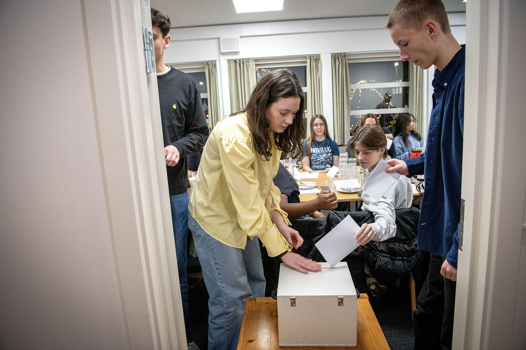 En gruppe unge deltager i en afstemning under et møde.