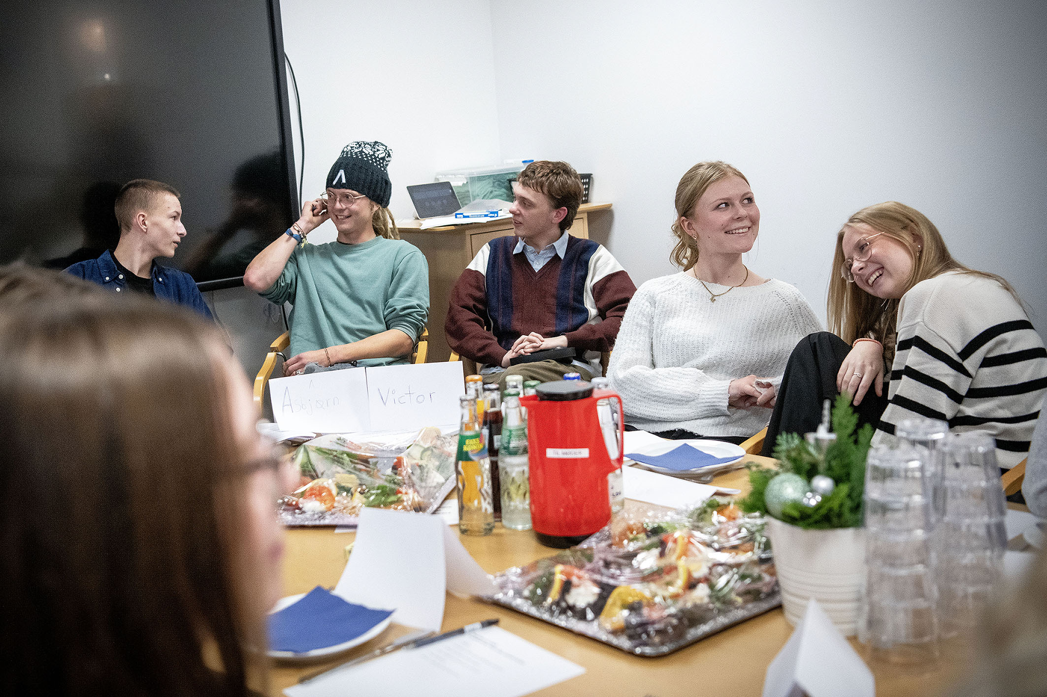 Fem personer sidder ved et bord med mad og drikke. De smiler og ser ud til at have en afslappet samtale i et mødelokale.