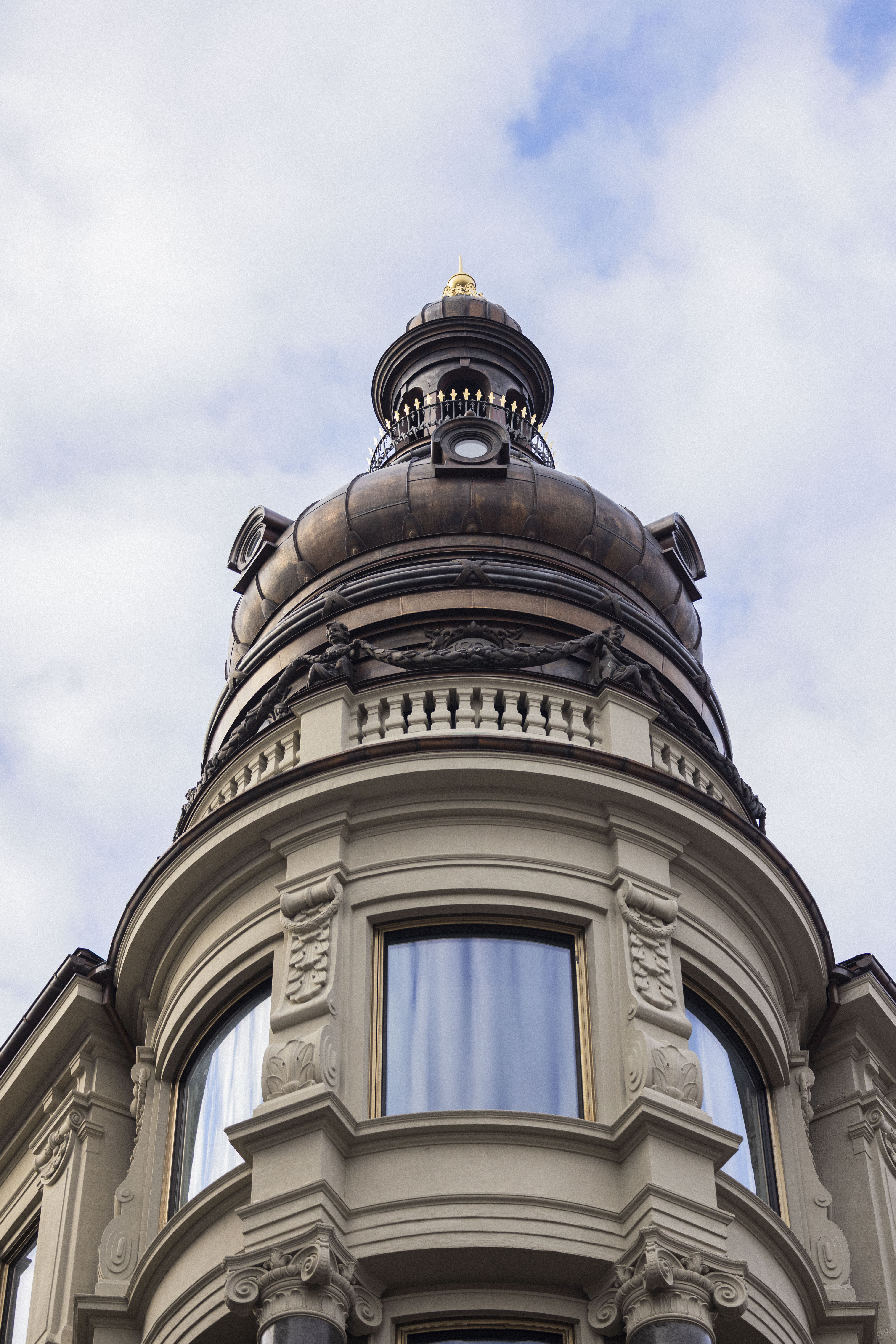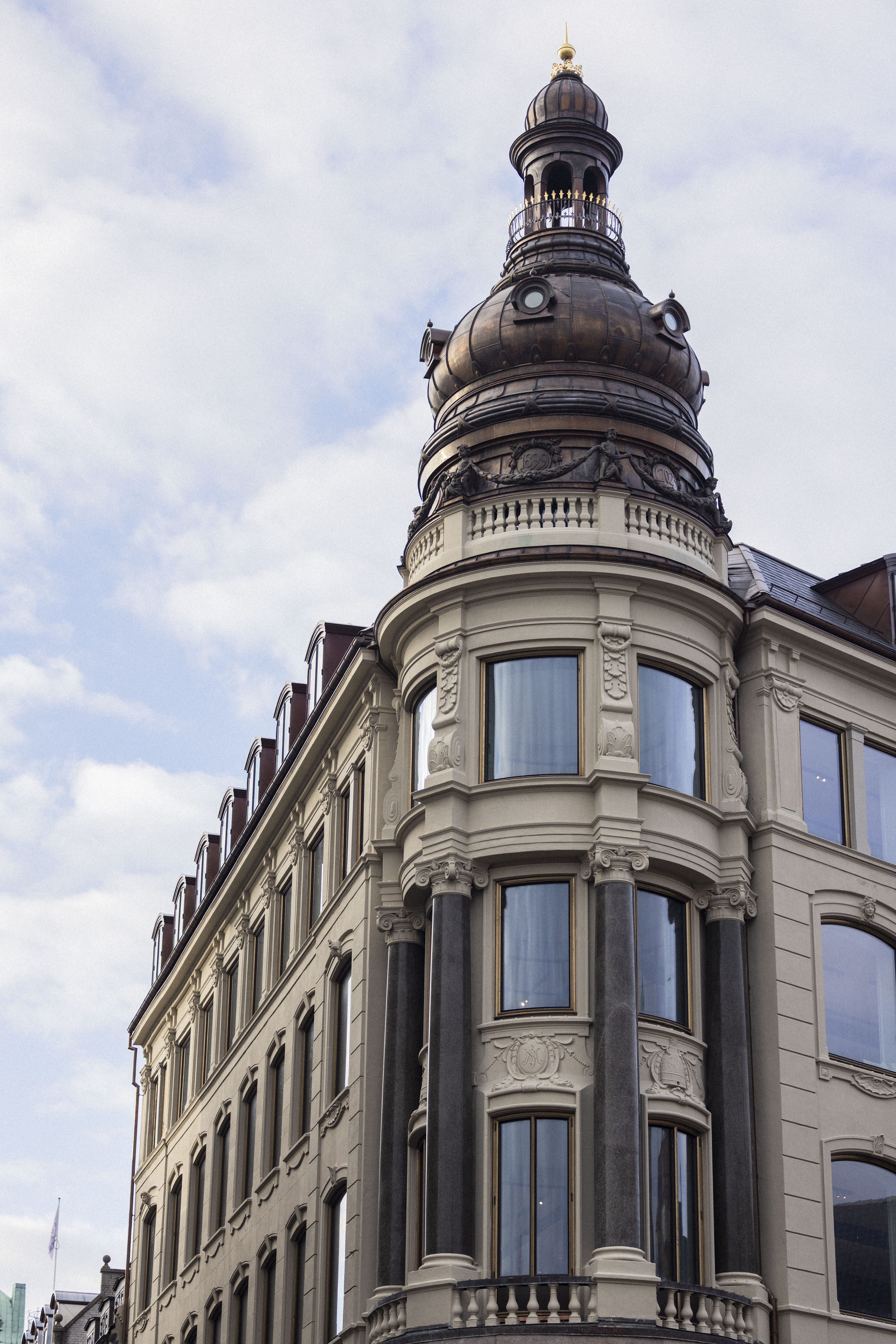 • Den oprindelige vinduesudformning er genskabt med nye markante vinduespartier udført i massivt messing og stål, og kobbertårnets gamle dele er blevet brugt som skabelon for at genskabe tårnets oprindelige pragt med det forgyldte spir.