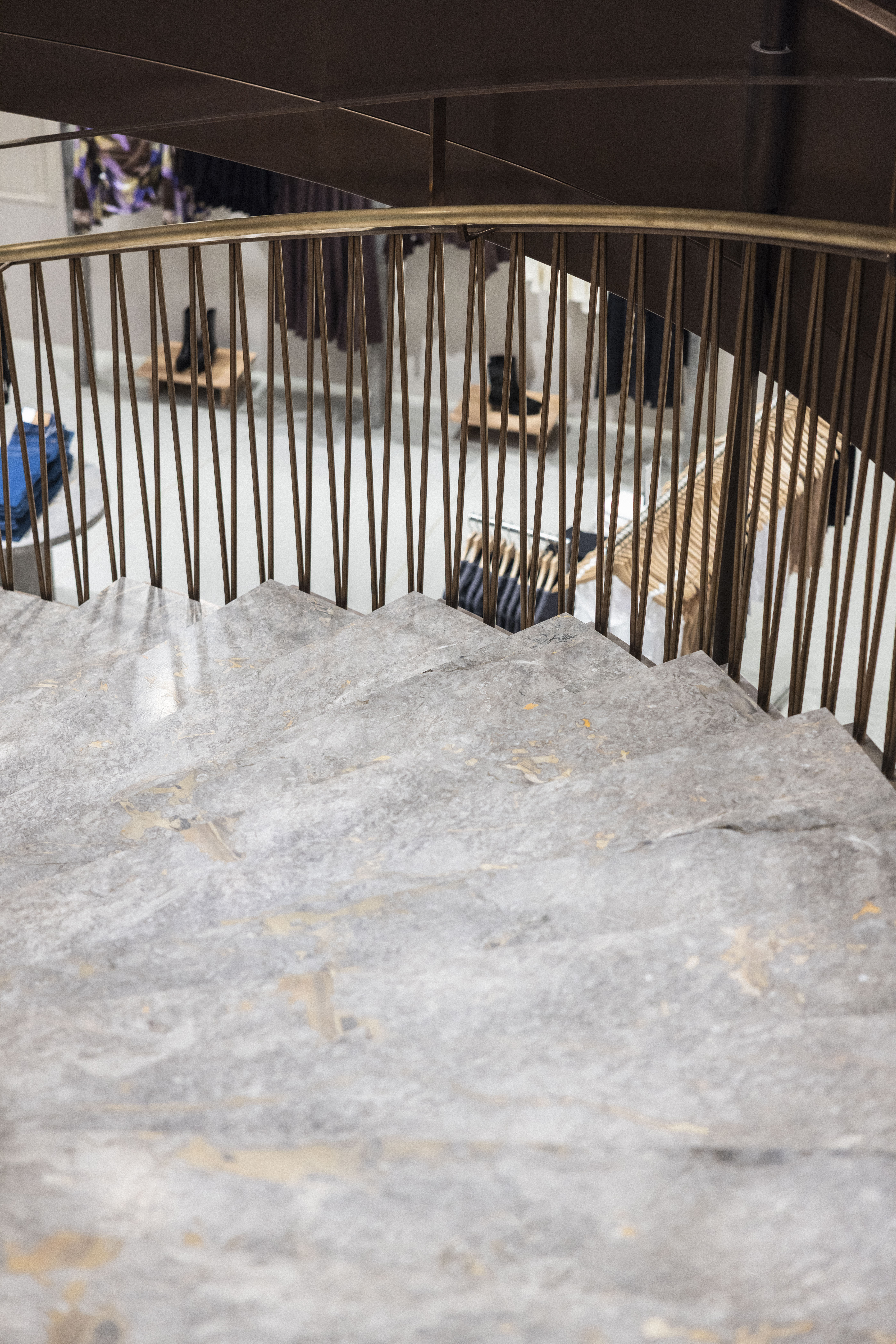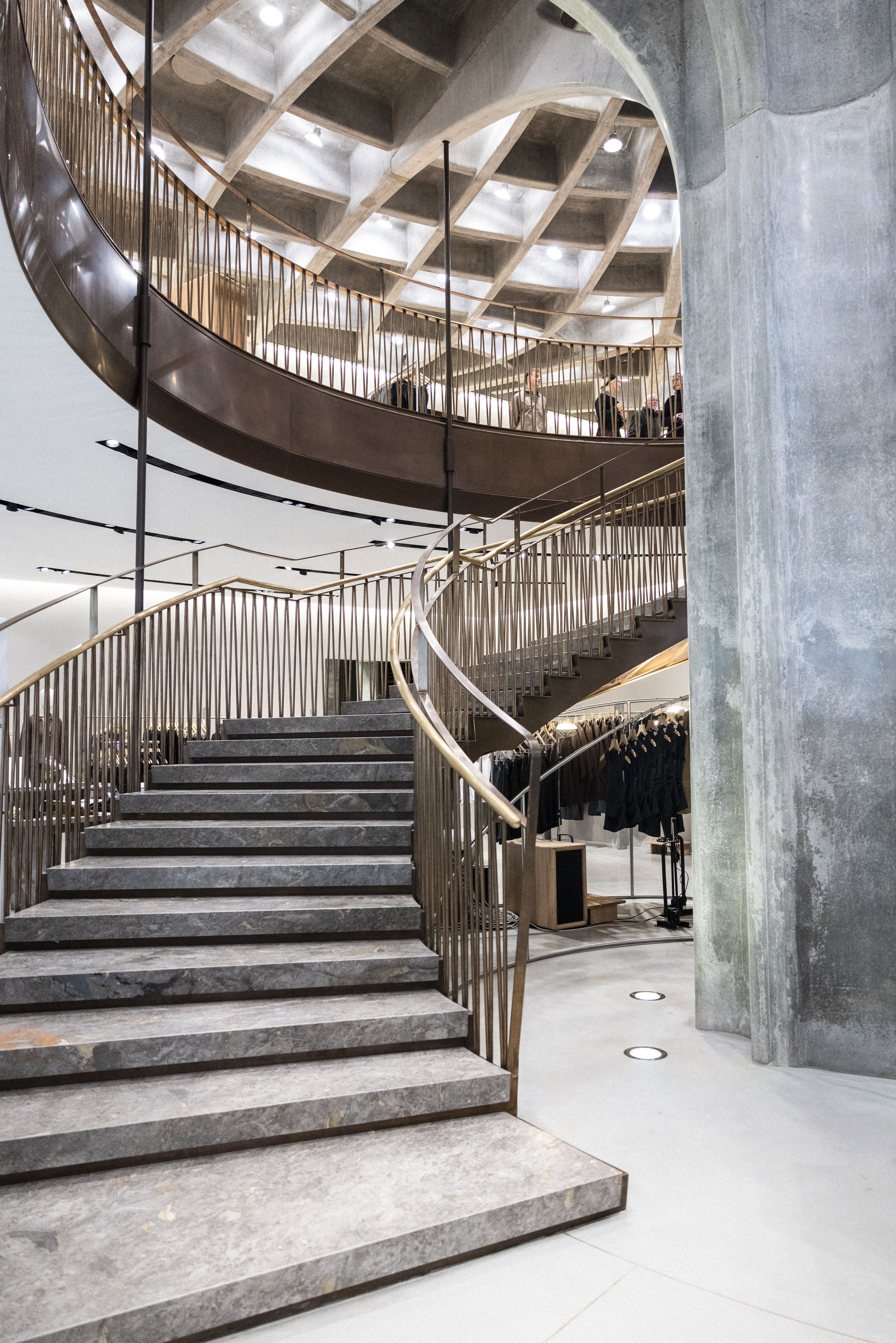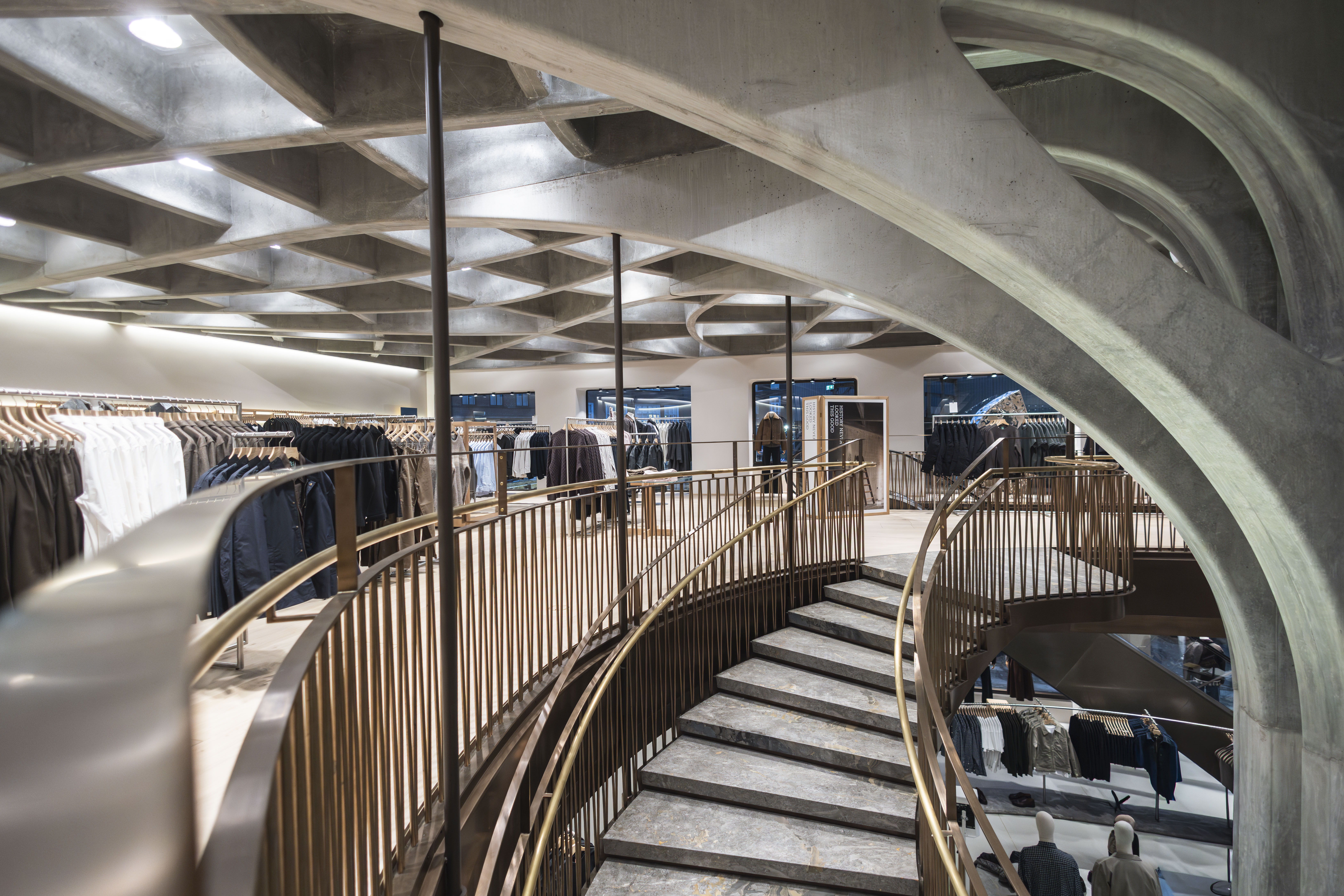 Den nye BESTSELLER-butik er bygget op omkring én enkelt markant betonsøjle og en trappe i rustfrit stål og marmor, som forbinder butikkens to etager.