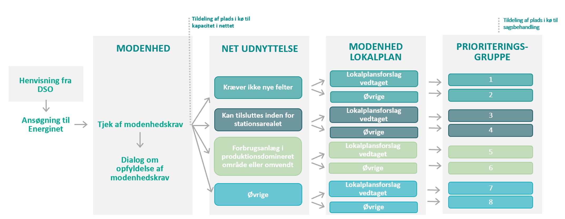 Hvis netkundens projekt lever på til minimumskrav for modenhed, kommer projektet ind i køen til screening i en af otte prioriteringsgrupper (se figuren). Projektets placering i en prioriteringsgruppe afhænger af, hvor godt projektet udnytter det eksisterende net, og om der er vedtaget et lokalplansforslag. Projekter, som er kommet langt i den kommunale myndighedsproces, prioriteres dermed over projekter, som ikke er kommet så langt. Og projekter, der kræver mindre udbygning af elnettet, prioriteres over projekter, der kræver mere udbygning.