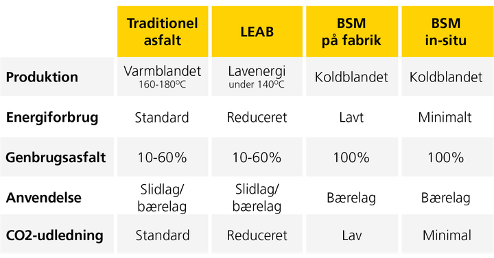 Ved at kombinere et bærelag i BSM med et slidlag i LEAB opnår man en halvering i det samlede klimaaftryk fra produktionen af belægning til en ny cykelsti.