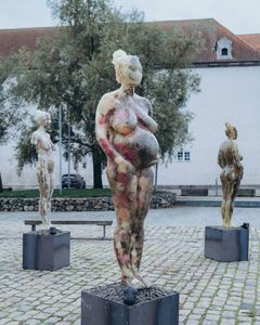 The opening presented works from the artist’s “Pregnant Series” — sculptures cast from Kulykivska’s own body five months before the full-scale Russian invasion. Inside the transparent forms lie bullet casings, mine fragments, and dried flowers collected from frontline and war-affected regions of Ukraine. These figures embody life and death, fragility and strength — forces that coexist within the human body, which becomes, involuntarily, a “battlefield”.